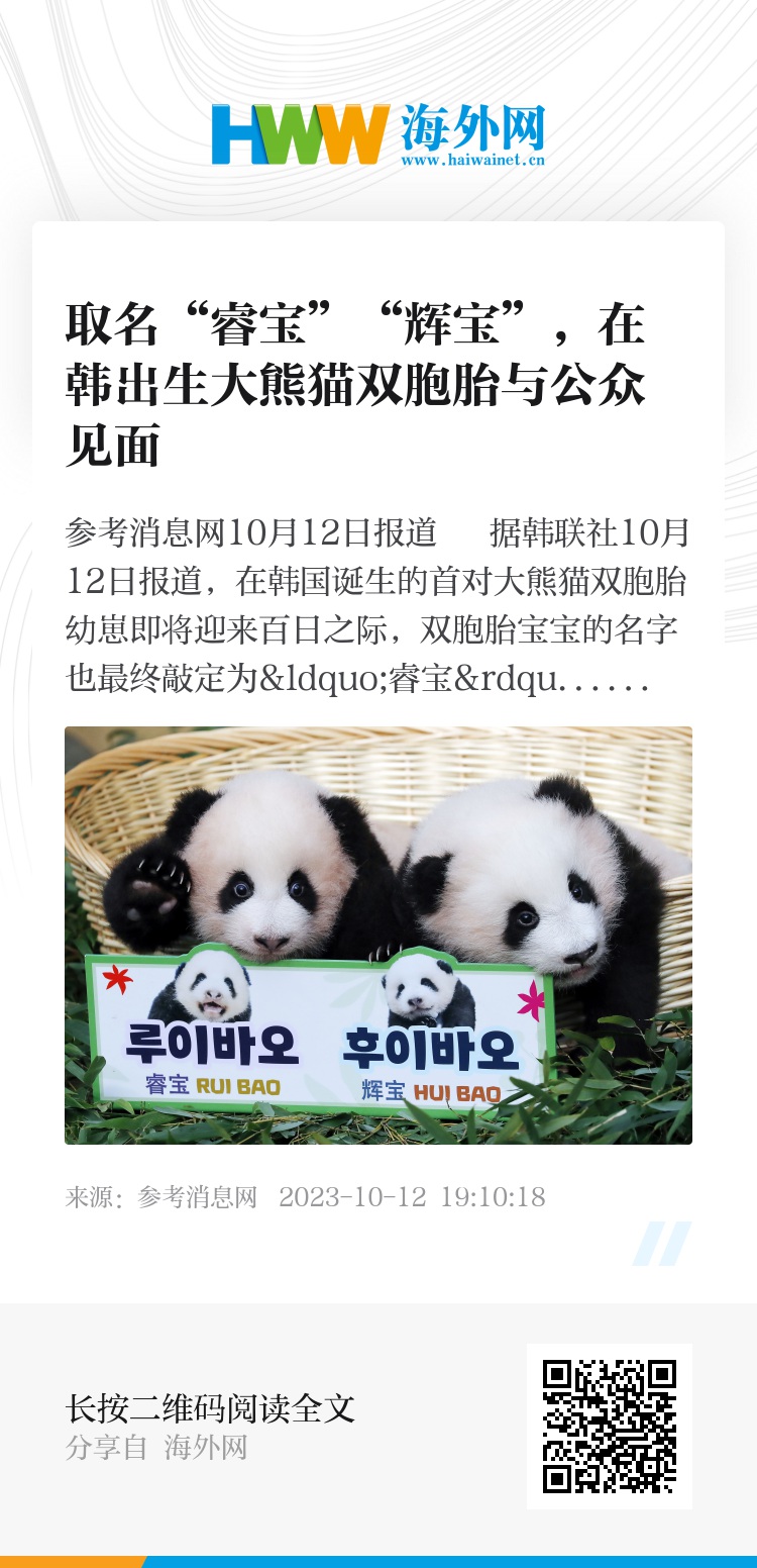 参考消息网10月12日报道 据韩联社10月12日报道,在韩国诞生的首对大熊猫双胞胎幼崽即将迎来百日之际,双胞胎宝宝的名字也最终敲定为“睿宝”和“辉宝”,分别意为“机智的宝贝”和“耀眼的宝贝”。
