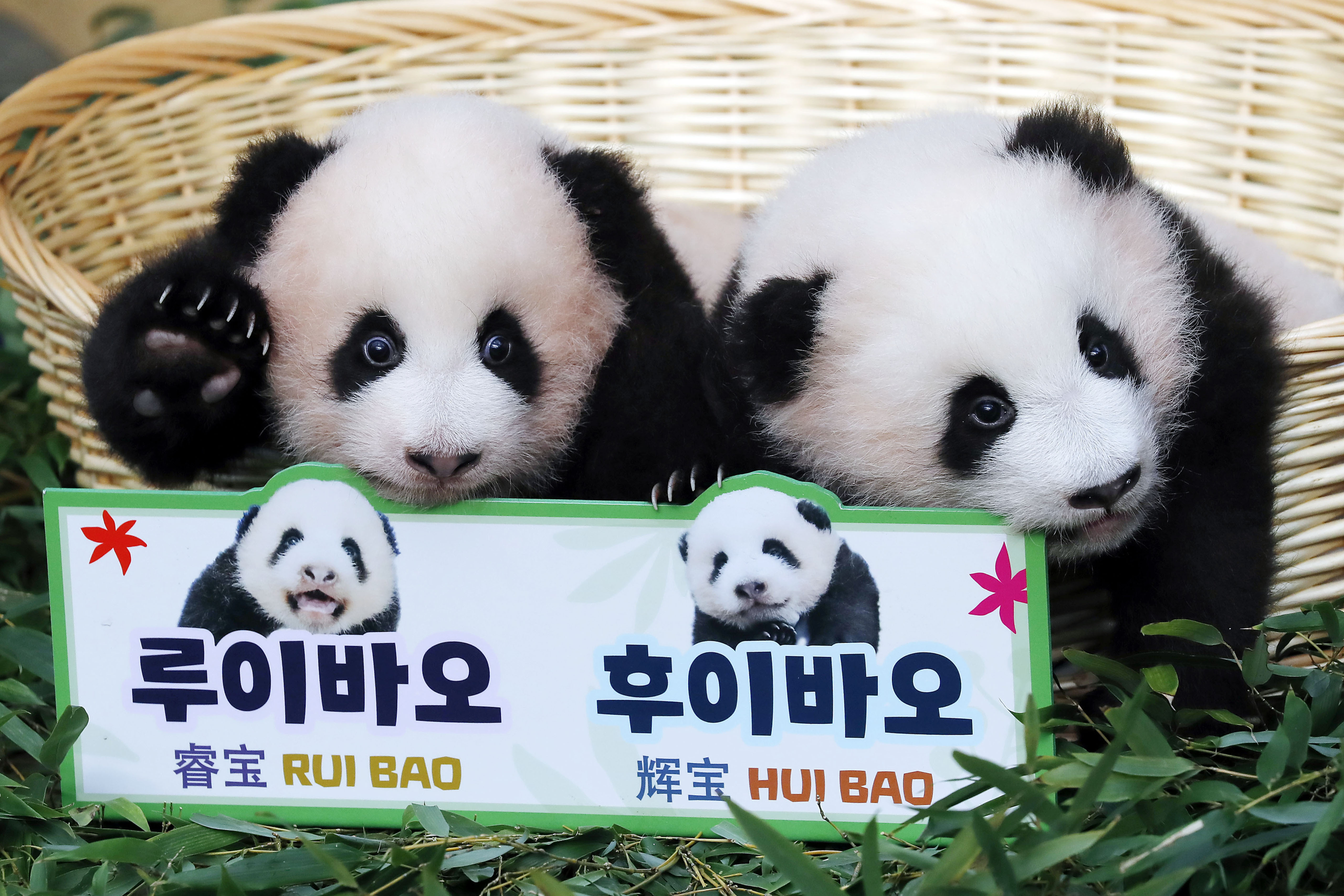 12日在韩国龙仁拍摄的大熊猫“睿宝”和“辉宝”(美联社)