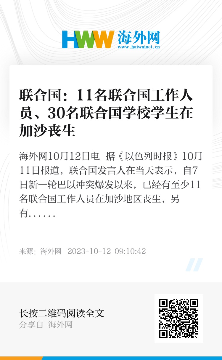 海外网10月12日电 据《以色列时报》10月11日报道,联合国发言人在当天表示,自7日新一轮巴以冲突爆发以来,已经有至少11名联合国工作人员在加沙地区丧生,另有30名联合国主办学校内的学生死于战火。