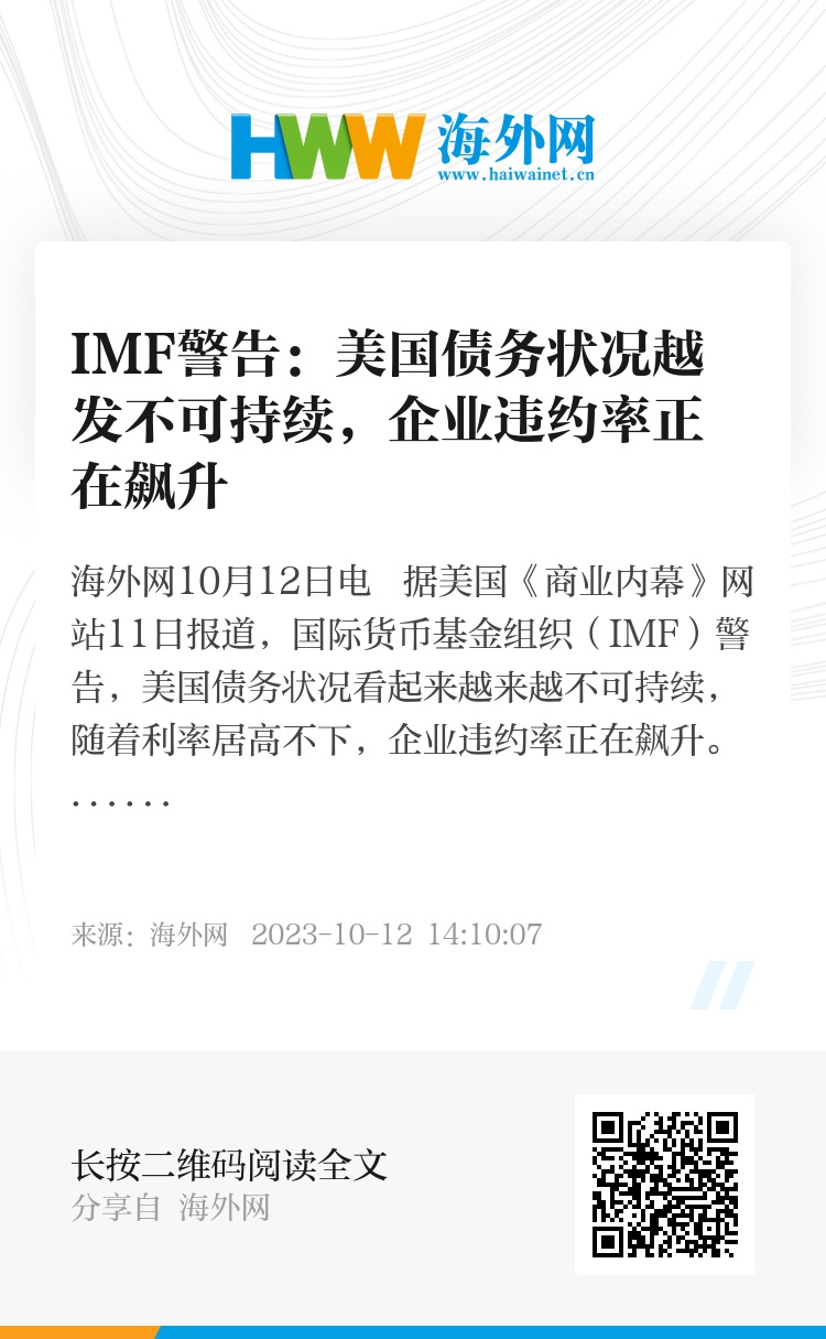海外网10月12日电 据美国《商业内幕》网站11日报道,国际货币基金组织(IMF)警告,美国债务状况看起来越来越不可持续,随着利率居高不下,企业违约率正在飙升。