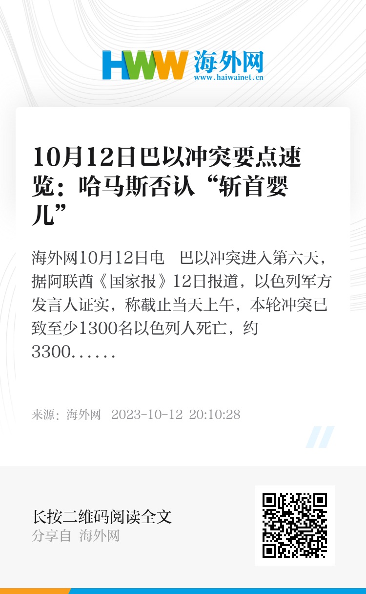 据美国有线电视新闻网消息,以色列总理内塔尼亚胡的发言人塔尔·海因里希11日表示,在巴勒斯坦伊斯兰抵抗运动(哈马斯)于上星期末对以色列发起袭击后,以方在以色列南部卡法阿扎发现一些婴幼儿被“斩首”。类似指责此前已在以色列媒体中出现。与此同时,美国有线电视新闻网称,哈马斯当天“强烈驳斥”有关其武装人员袭击儿童的“虚假报道”。