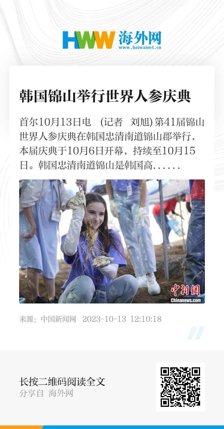 中新网首尔10月13日电 (记者 刘旭)第41届锦山世界人参庆典在韩国忠清南道锦山郡举行,本届庆典于10月6日开幕,持续至10月15日。韩国忠清南道锦山是韩国高丽参的重要产地之一,被誉为韩国高丽参的故乡,每年秋季都会举办锦山人参庆典。