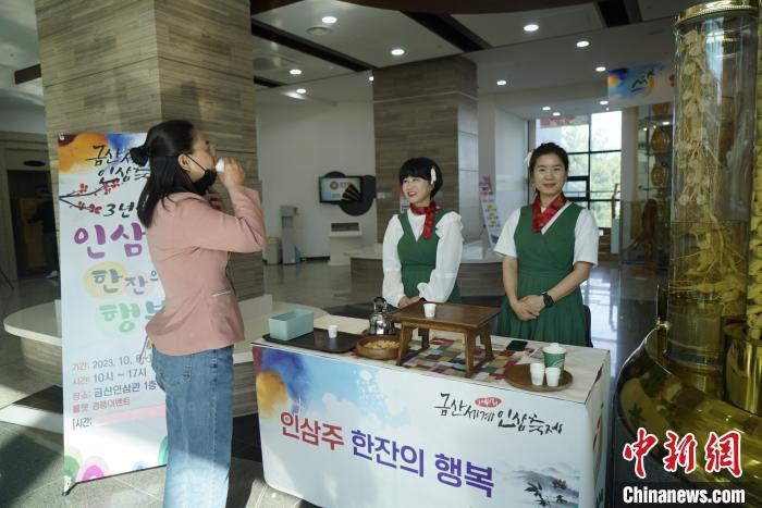 图为10月11日,游客在人参庆典上品尝人参酒。中新社记者 刘旭 摄