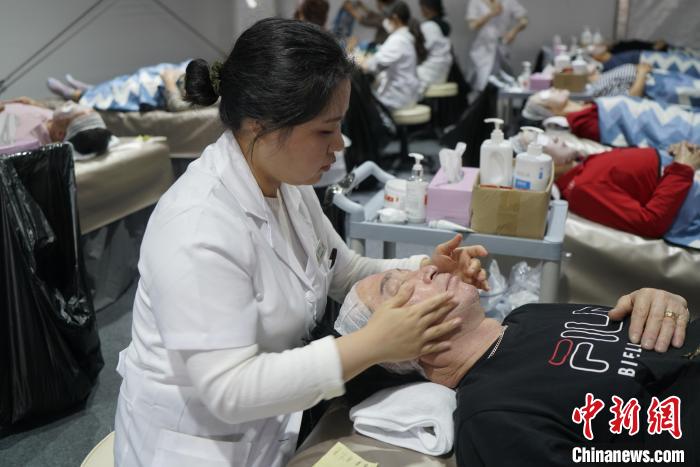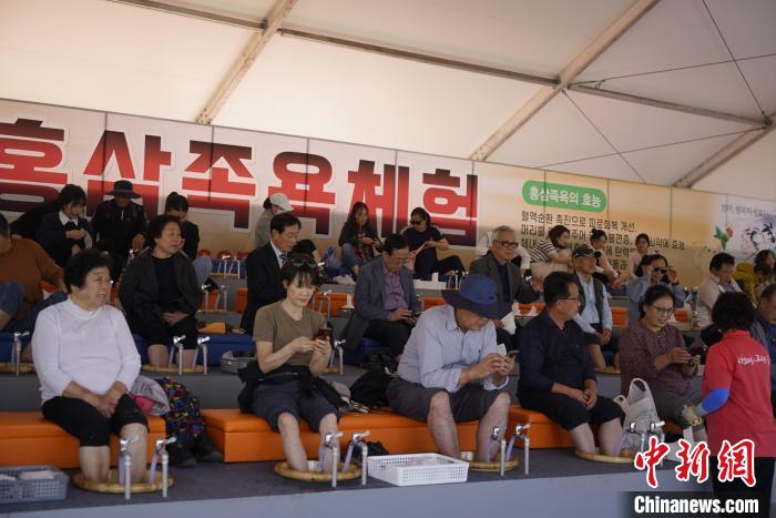 图为10月11日,游客在人参庆典上体验红参足浴。中新社记者 刘旭 摄