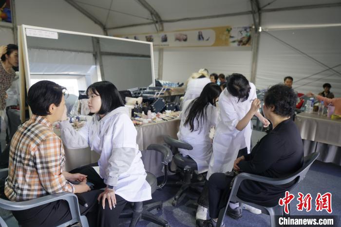 图为10月11日,游客在人参庆典上体验红参护肤。中新社记者 刘旭 摄