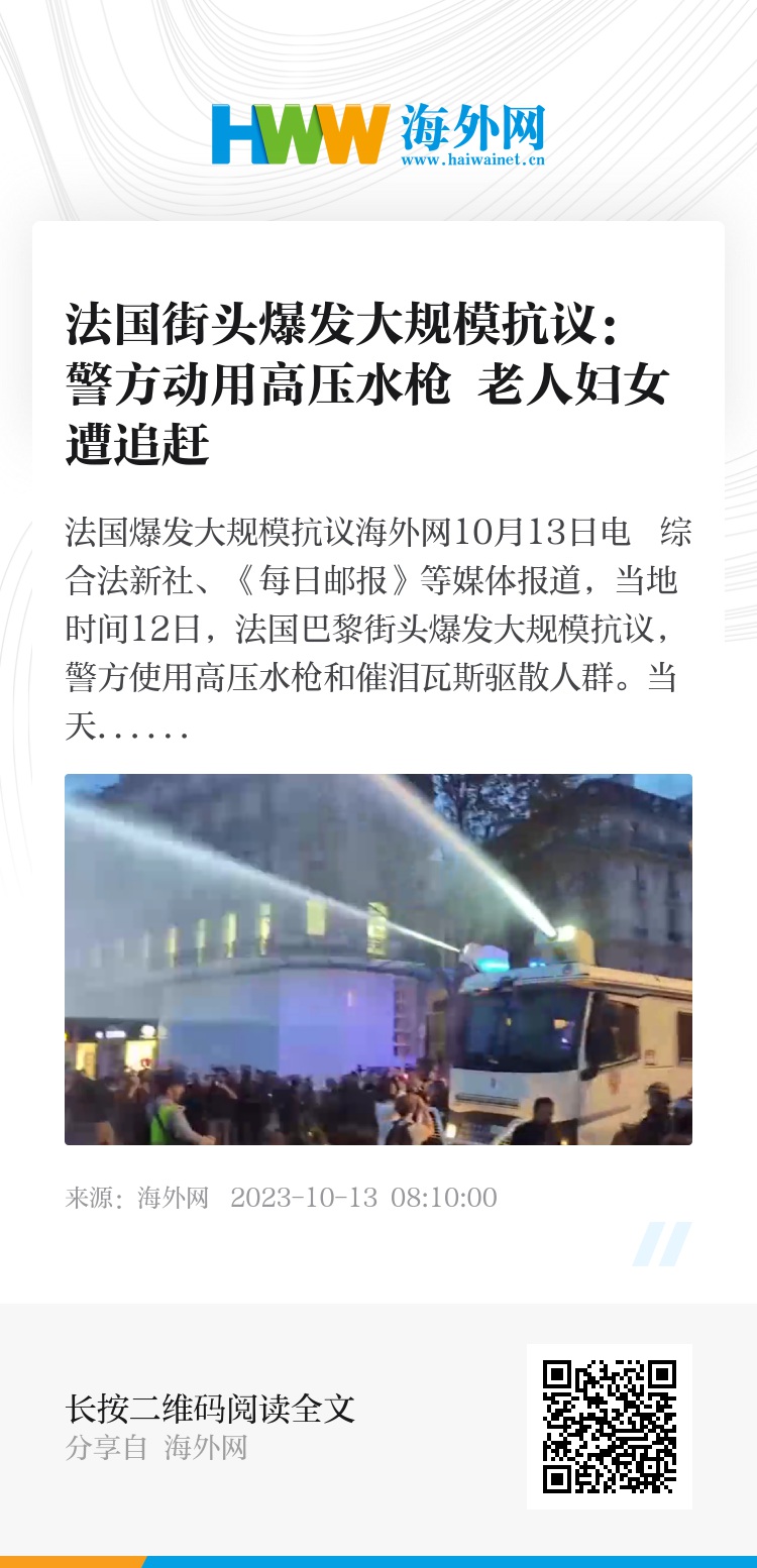 海外网10月13日电 综合法新社、《每日邮报》等媒体报道,当地时间12日,法国巴黎街头爆发大规模抗议,警方使用高压水枪和催泪瓦斯驱散人群。