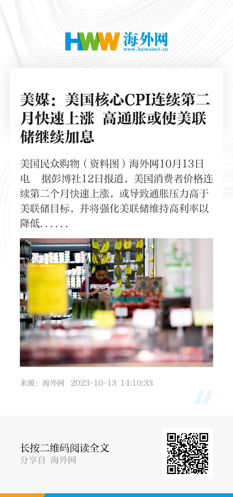 海外网10月13日电 据彭博社12日报道,美国消费者价格连续第二个月快速上涨,或导致通胀压力高于美联储目标,并将强化美联储维持高利率以降低通胀的意图。