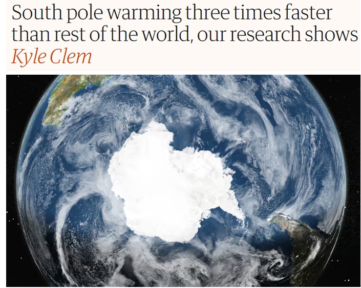 《自然气候变化》杂志曾披露,在过去30年间,南极的变暖速度是世界其他区域平均值的3倍,南极地区每10年会变暖0.6℃左右。