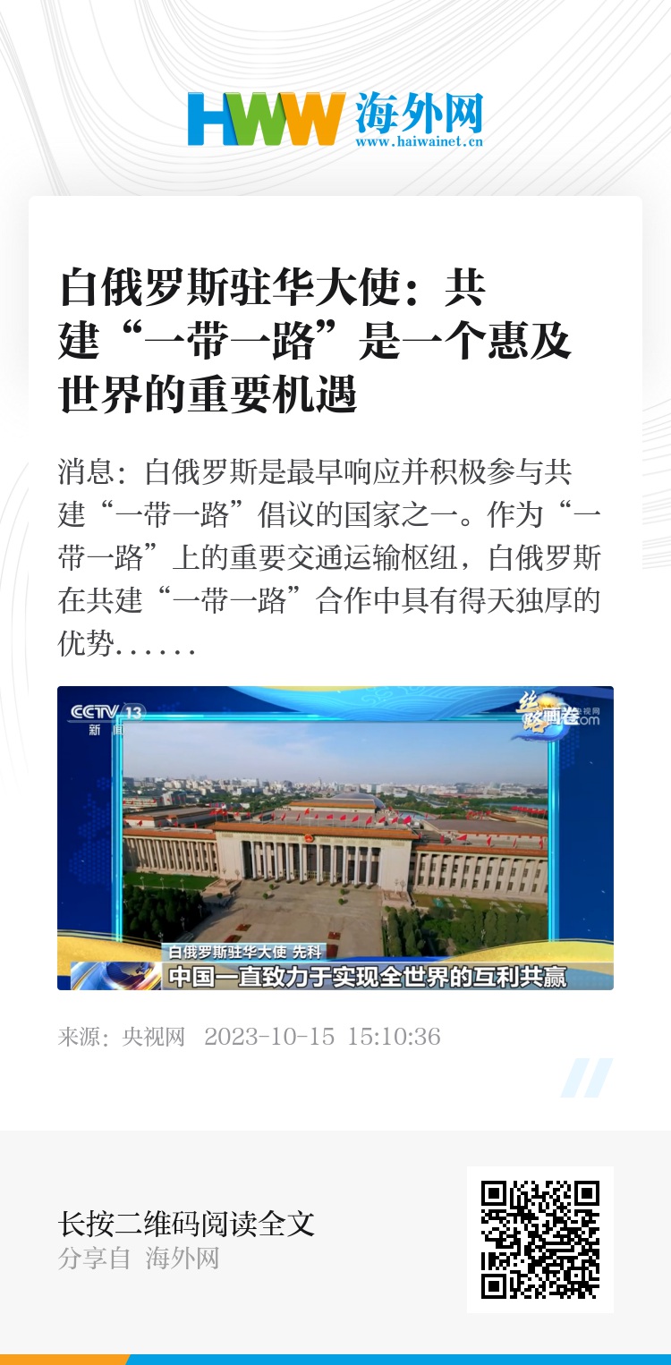 白俄罗斯驻华大使先科表示,共建“一带一路”是一个惠及世界的重要机遇。期待在即将举行的第三届“一带一路”国际合作高峰论坛上,各方展开积极探讨,推进未来合作。