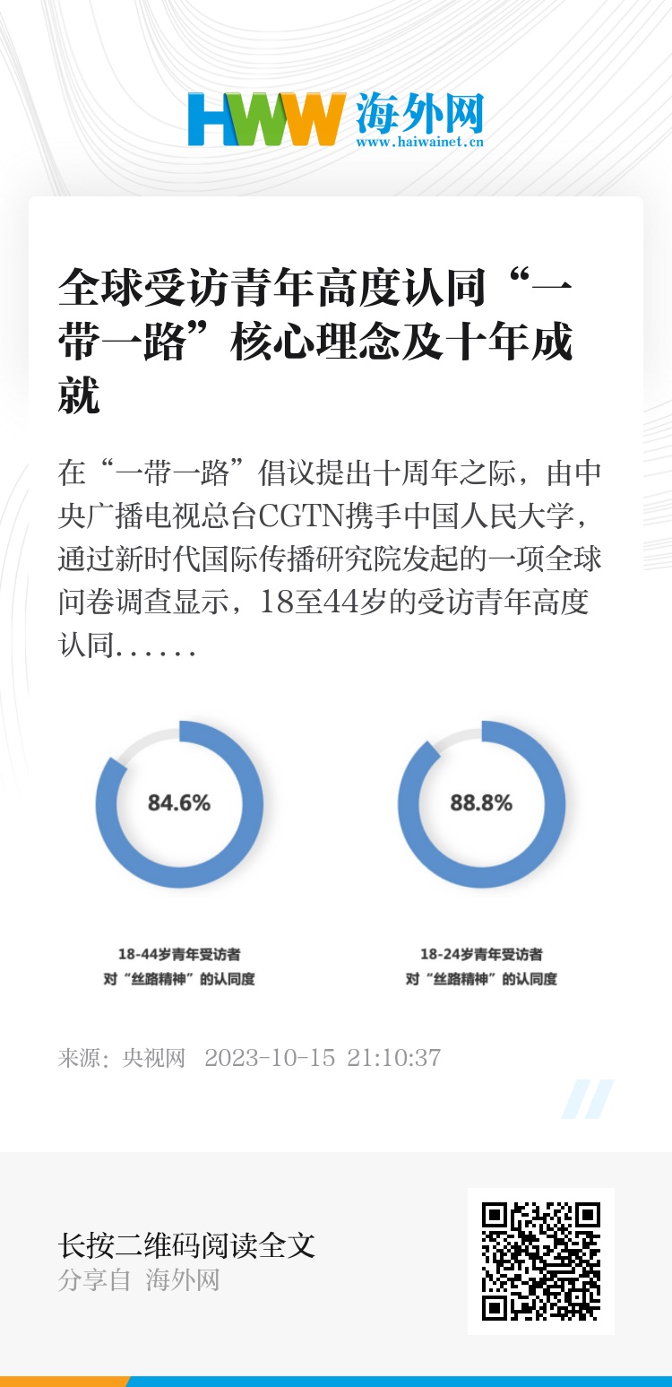 在“一带一路”倡议提出十周年之际,由中央广播电视总台CGTN携手中国人民大学,通过新时代国际传播研究院发起的一项全球问卷调查显示,18至44岁的受访青年高度认同“一带一路”倡议的核心理念,对共建“一带一路”十年来所取得的非凡成就高度赞赏。