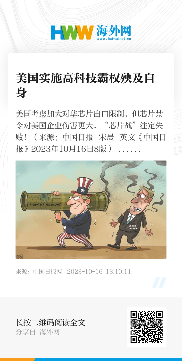 美国考虑加大对华芯片出口限制,但芯片禁令对美国企业伤害更大,“芯片战”注定失败!(来源:中国日报 宋晨 英文《中国日报》2023年10月16日8版)