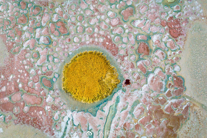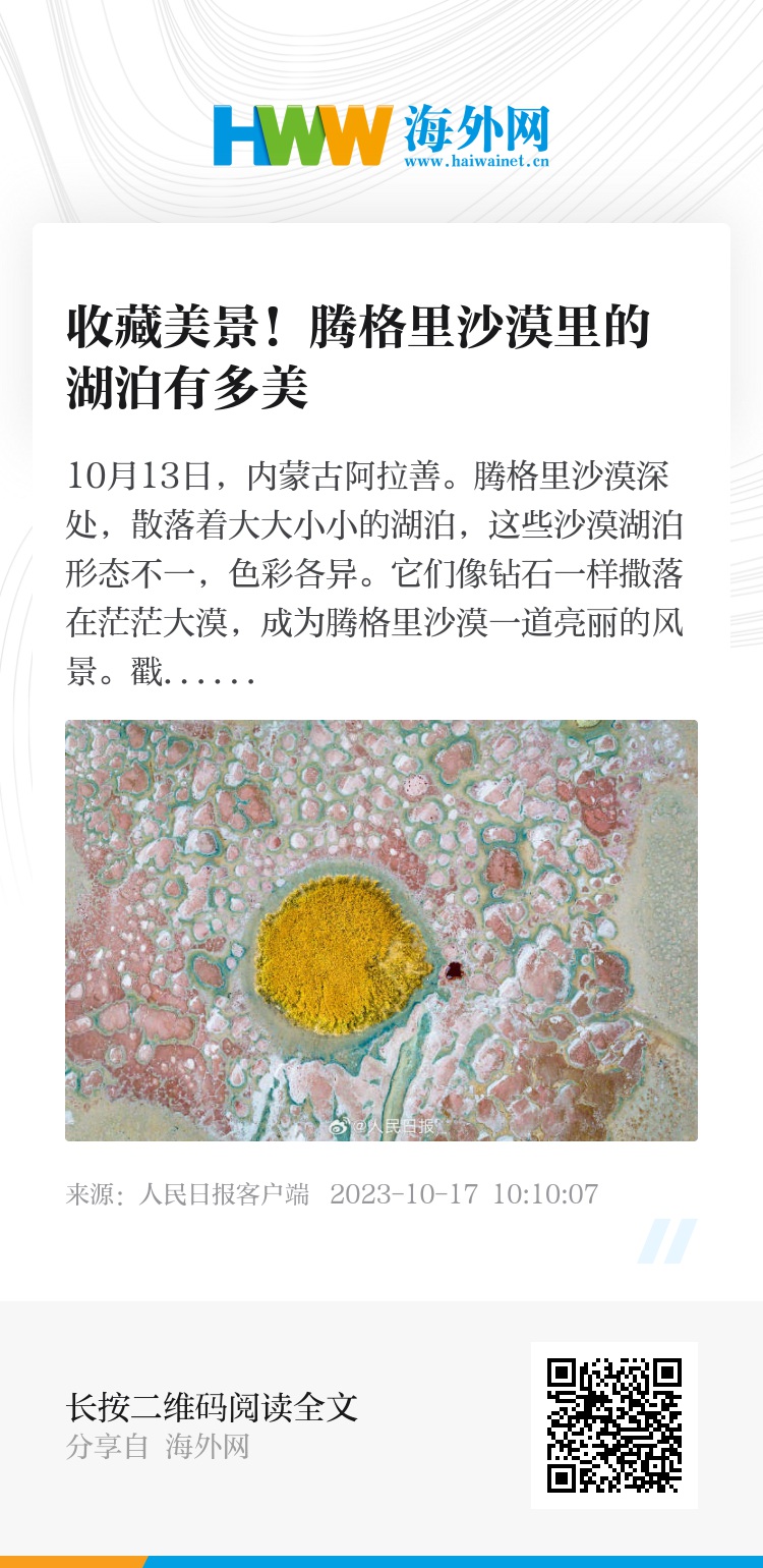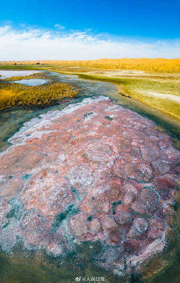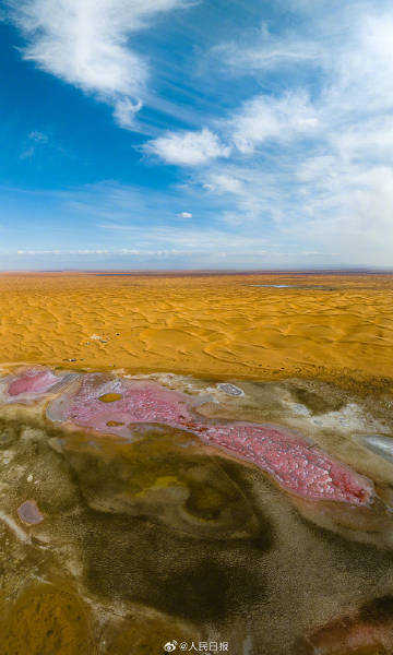 10月13日,内蒙古阿拉善。腾格里沙漠深处,散落着大大小小的湖泊,这些沙漠湖泊形态不一,色彩各异。它们像钻石一样撒落在茫茫大漠,成为腾格里沙漠一道亮丽的风景。戳图感受↓↓↓