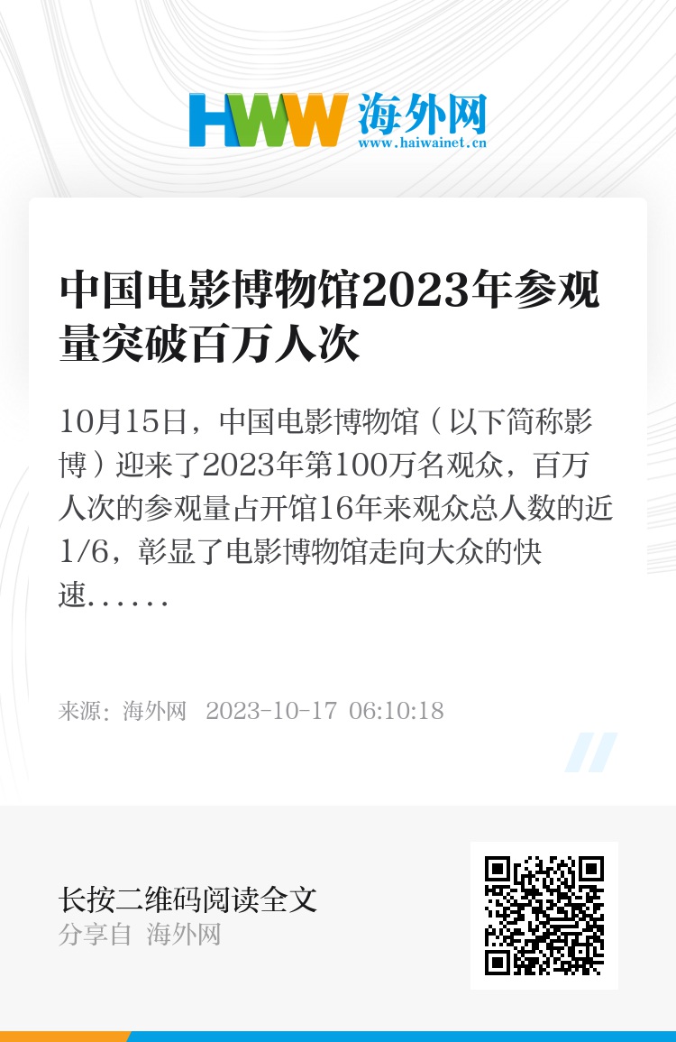 10月15日,中国电影博物馆(以下简称影博)迎来了2023年第100万名观众,百万人次的参观量占开馆16年来观众总人数的近1/6,彰显了电影博物馆走向大众的快速脚步。