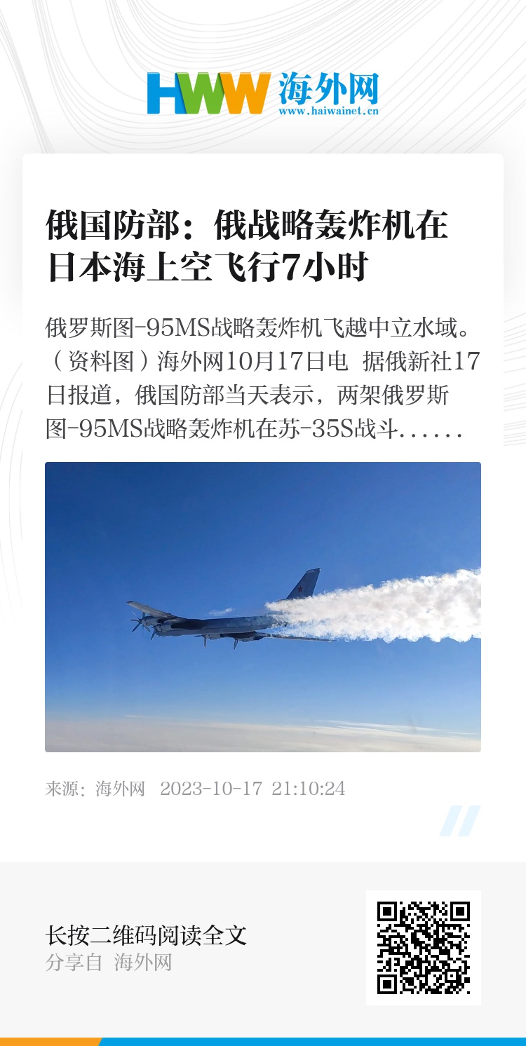 海外网10月17日电 据俄新社17日报道,俄国防部当天表示,两架俄罗斯图-95MS战略轰炸机在苏-35S战斗机伴飞下,于日本海中立水域上空飞行了约7个小时。