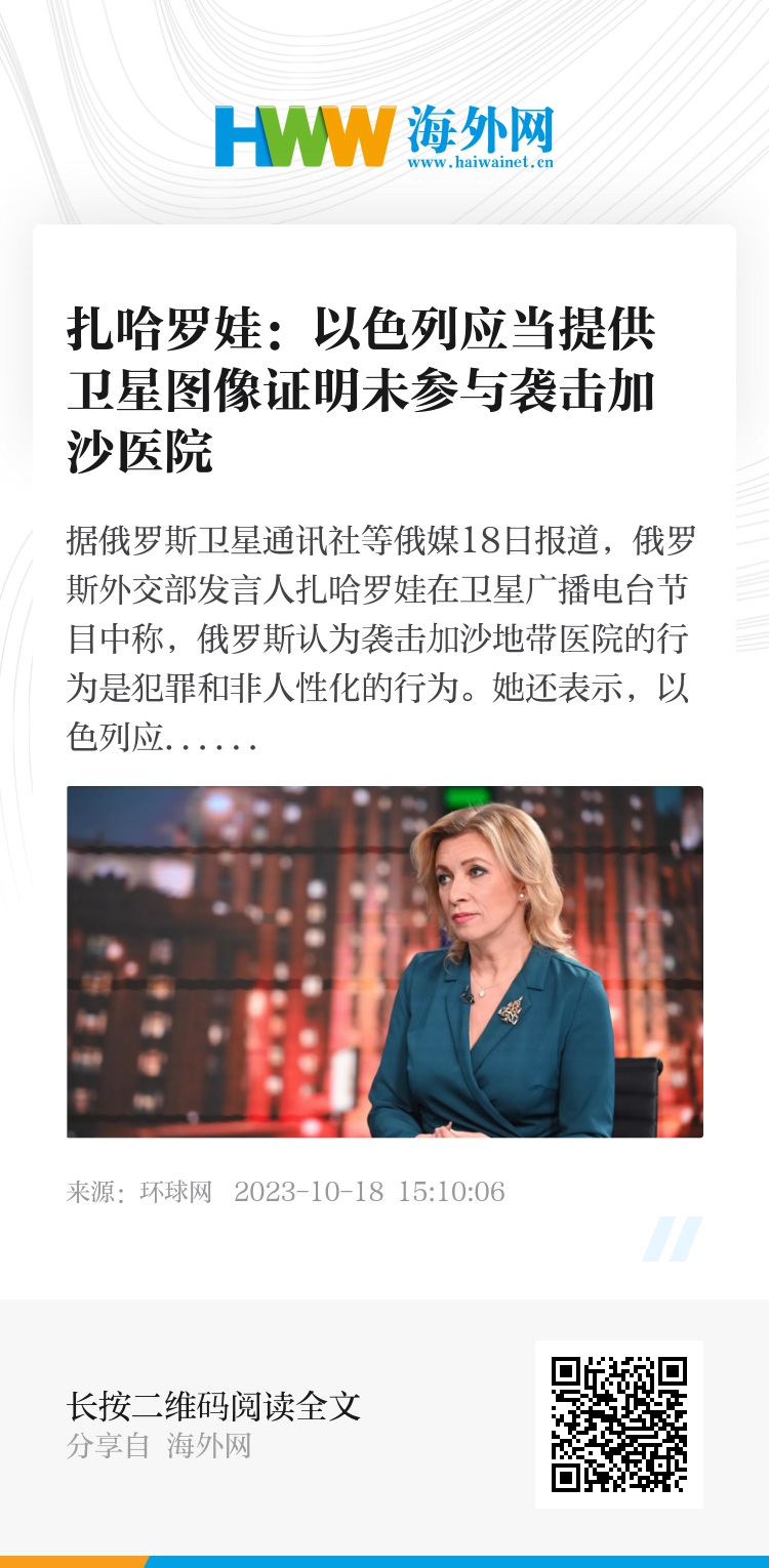 据俄罗斯卫星通讯社等俄媒18日报道,俄罗斯外交部发言人扎哈罗娃在卫星广播电台节目中称,俄罗斯认为袭击加沙地带医院的行为是犯罪和非人性化的行为。她还表示,以色列应当提供卫星图像,以证明其未参与袭击加沙医院。