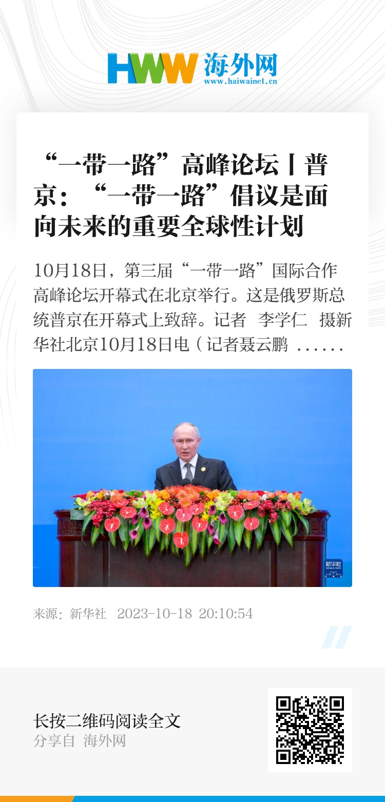 新华社北京10月18日电(记者聂云鹏 魏梦佳)俄罗斯总统普京18日出席第三届“一带一路”国际合作高峰论坛开幕式时表示,“一带一路”倡议旨在推动构建一个更加公正的多极世界,是面向未来的重要全球性计划。