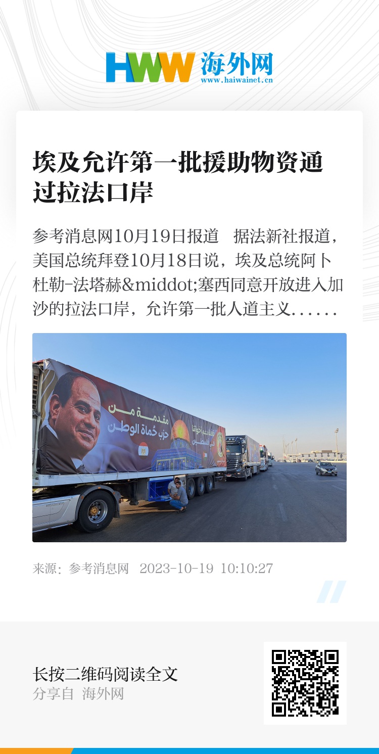 参考消息网10月19日报道 据法新社报道,美国总统拜登10月18日说,埃及总统阿卜杜勒-法塔赫·塞西同意开放进入加沙的拉法口岸,允许第一批人道主义援助卡车通过。