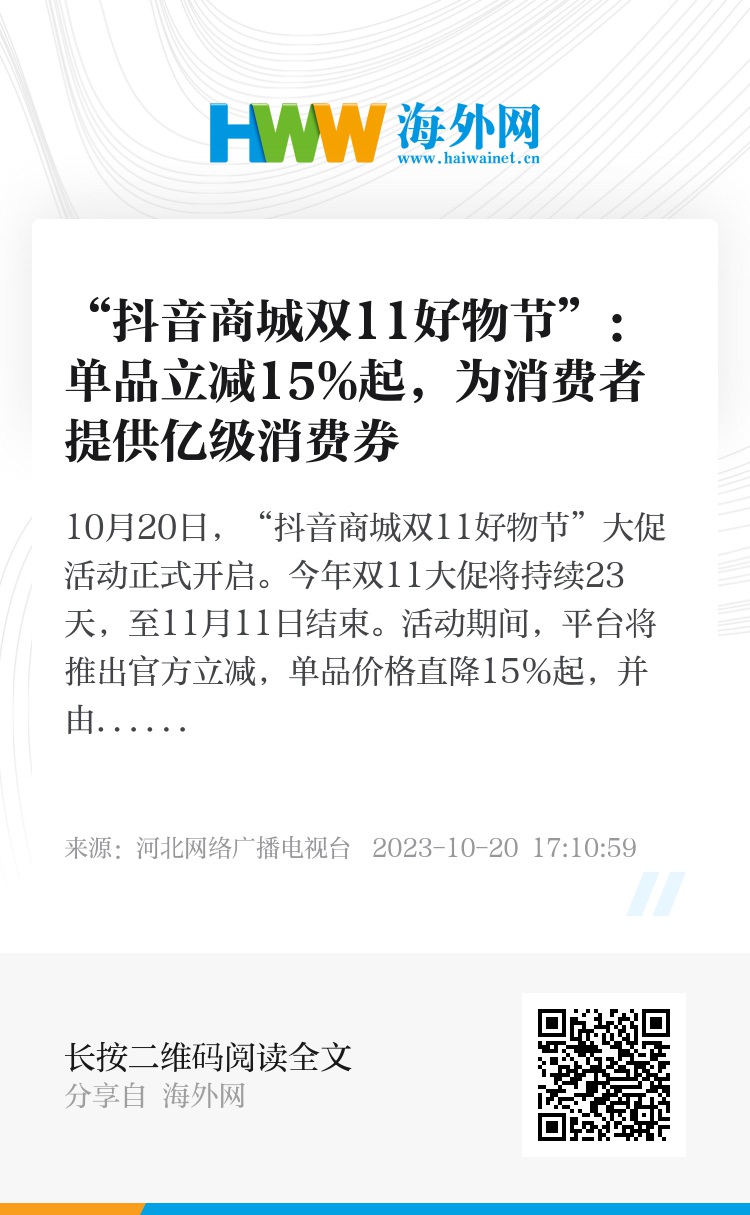 10月20日,“抖音商城双11好物节”大促活动正式开启。今年双11大促将持续23天,至11月11日结束。活动期间,平台将推出官方立减,单品价格直降15%起,并由平台出资提供亿级消费券,给到实实在在的价格优惠。