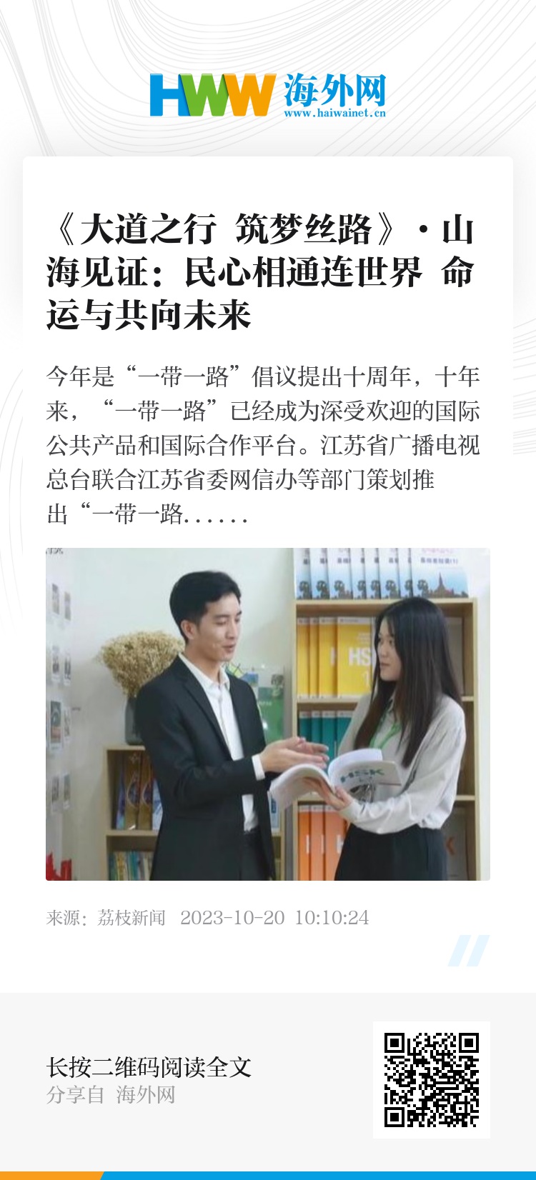 今年是“一带一路”倡议提出十周年,十年来,“一带一路”已经成为深受欢迎的国际公共产品和国际合作平台。江苏省广播电视总台联合江苏省委网信办等部门策划推出“一带一路”十周年大型融媒体项目“大道之行 筑梦丝路”。该项目由中央网信办网络传播局指导,得到江苏省委宣传部的大力支持。主题采访“大道之行 筑梦丝路”之《山海见证》,多路记者带您共赴万里山海,探寻丝路足迹。