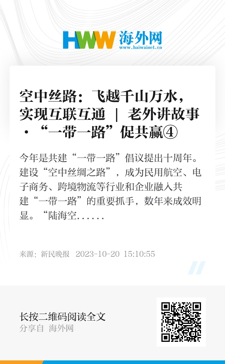 今年是共建“一带一路”倡议提出十周年。建设“空中丝绸之路”,成为民用航空、电子商务、跨境物流等行业和企业融入共建“一带一路”的重要抓手,数年来成效明显。“陆海空”一体化的新丝绸之路发展模式,更符合现代贸易发展的需求。建设“空中丝绸之路”,让跨境贸易更畅通、民心更相通,也为共建“一带一路”国家的企业和人民带来了实实在在的好处。