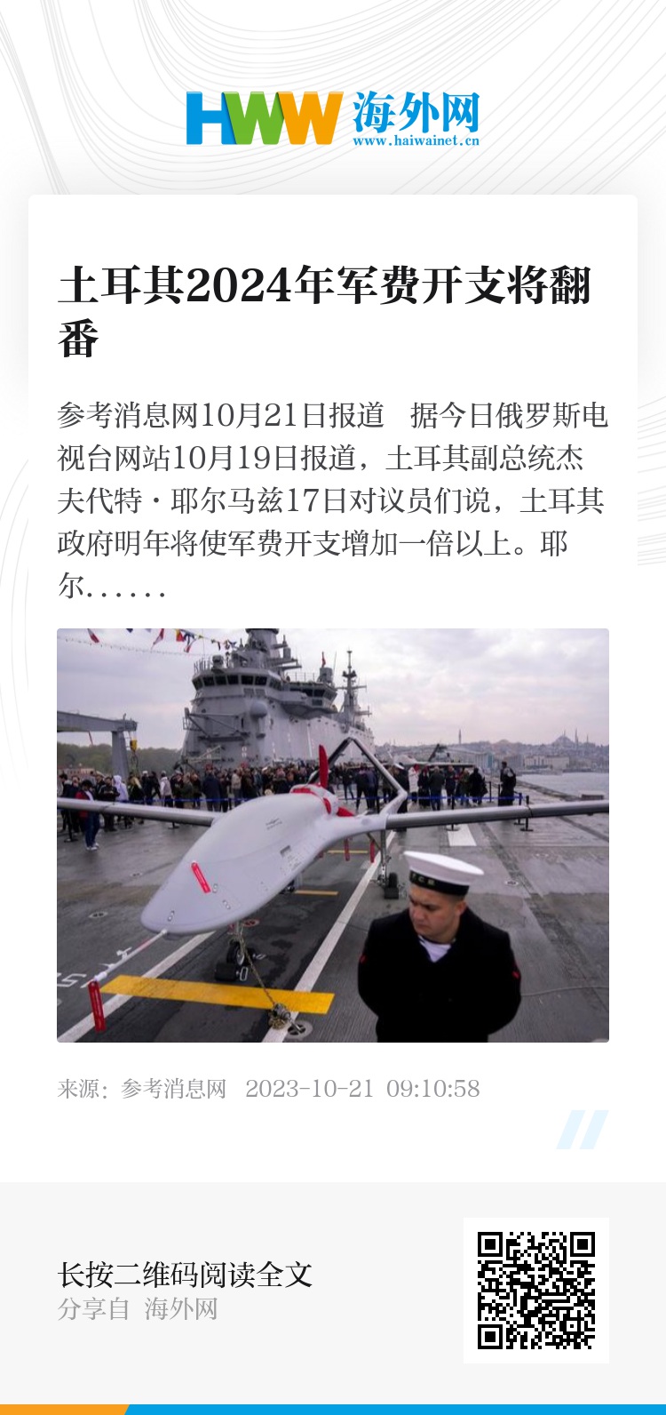 参考消息网10月21日报道 据今日俄罗斯电视台网站10月19日报道,土耳其副总统杰夫代特·耶尔马兹17日对议员们说,土耳其政府明年将使军费开支增加一倍以上。