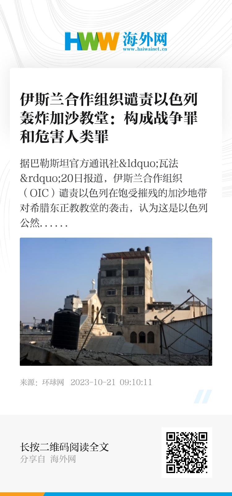 据巴勒斯坦官方通讯社“瓦法”20日报道,伊斯兰合作组织(OIC)谴责以色列在饱受摧残的加沙地带对希腊东正教教堂的袭击,认为这是以色列公然违反国际法和国际人道法,针对巴勒斯坦人民和礼拜场所犯下的又一罪行。