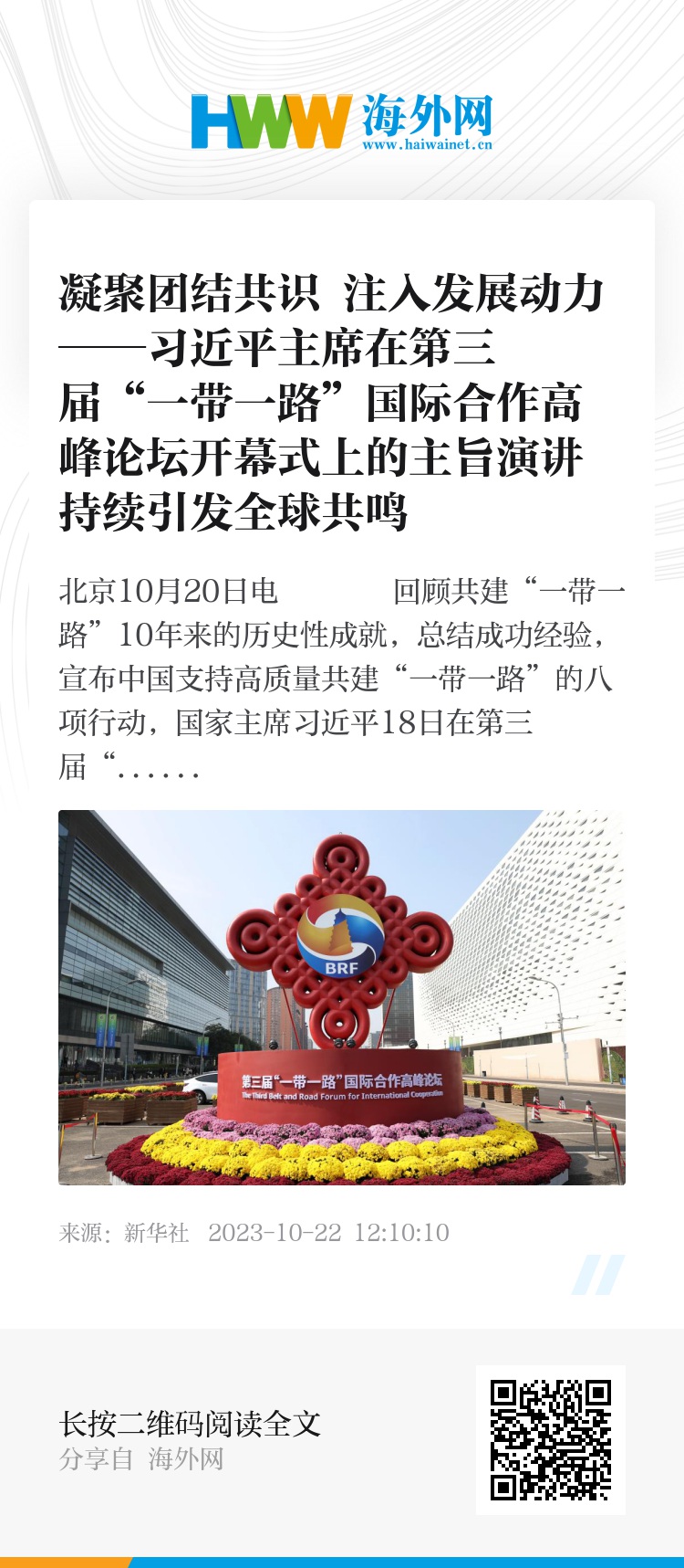 习近平主席的演讲持续引发国际社会广泛共鸣。海外舆论和人士认为,演讲凝聚团结共识、激发奋进力量。本届高峰论坛取得了丰硕成果,体现出共建“一带一路”的巨大号召力和全球影响力。他们指出,随着下一个金色十年的开启,共建“一带一路”进入高质量发展的新阶段,将为推动世界经济增长、促进全球共同发展作出新的重要贡献。