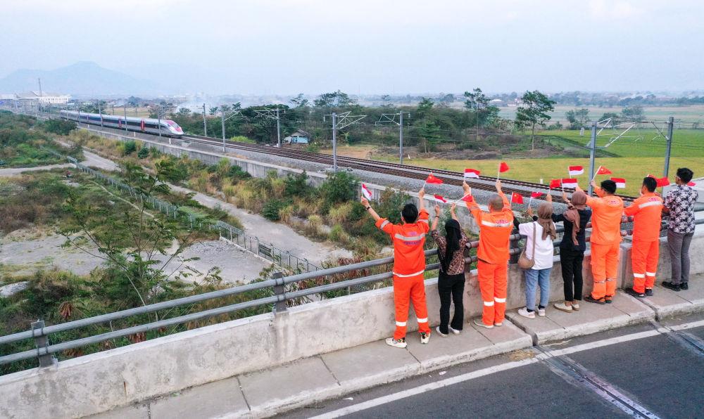 △2023年10月17日,在印度尼西亚万隆一座天桥上,雅万高铁中国建设者和印尼籍员工挥舞着中国和印尼两国国旗,向远处驶来的一列雅万高铁高速动车组列车欢呼。