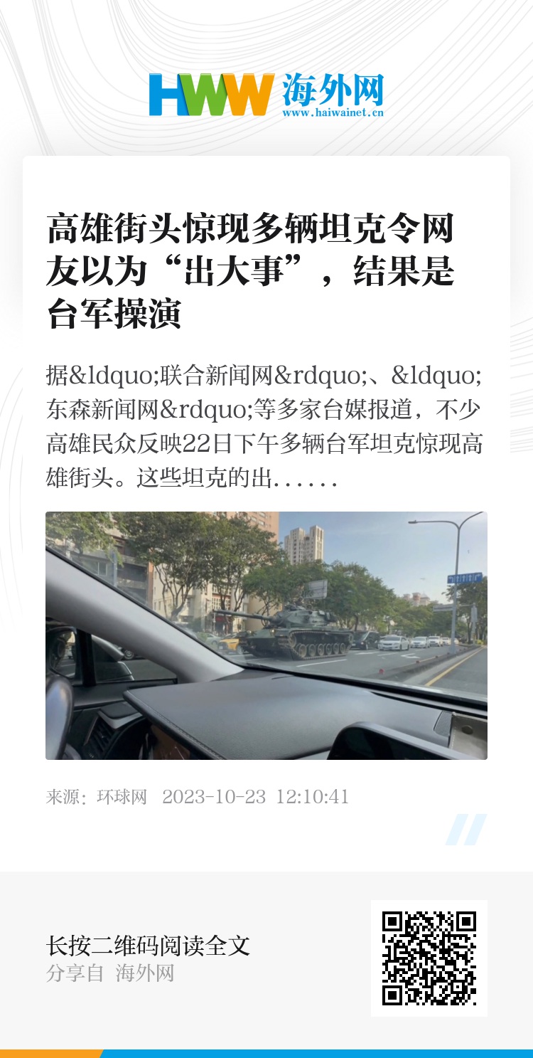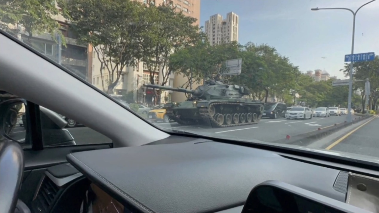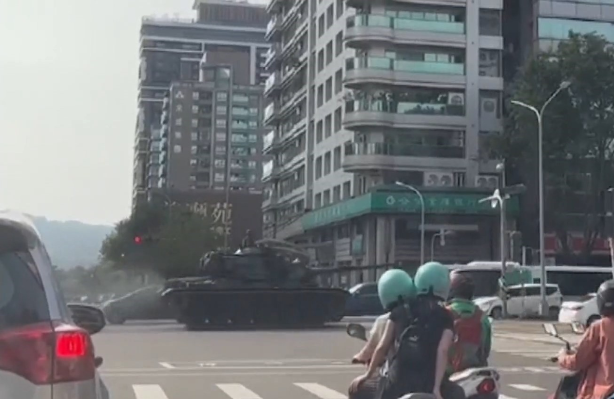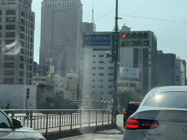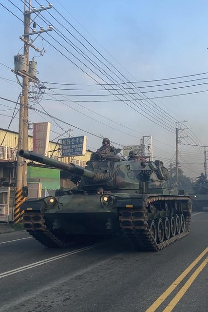 “东森新闻网”描述称,民众驾车行驶在高雄街头,对向迎面而来的居然是全副武装的军用装甲车。仔细观察后发现车顶架起机枪,坦克上有三名全副武装的台军士兵全程戒备。除装甲车以外,还有战车在马路上行驶,扬起大量沙尘,吸引民众目光。