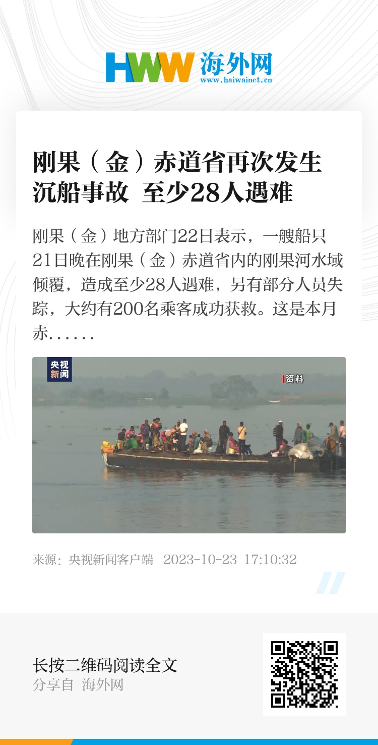 刚果(金)地方部门22日表示,一艘船只21日晚在刚果(金)赤道省内的刚果河水域倾覆,造成至少28人遇难,另有部分人员失踪,大约有200名乘客成功获救。这是本月赤道省刚果河发生的第二起严重沉船事故。13日夜间,一艘船倾覆造成至少47人死亡。