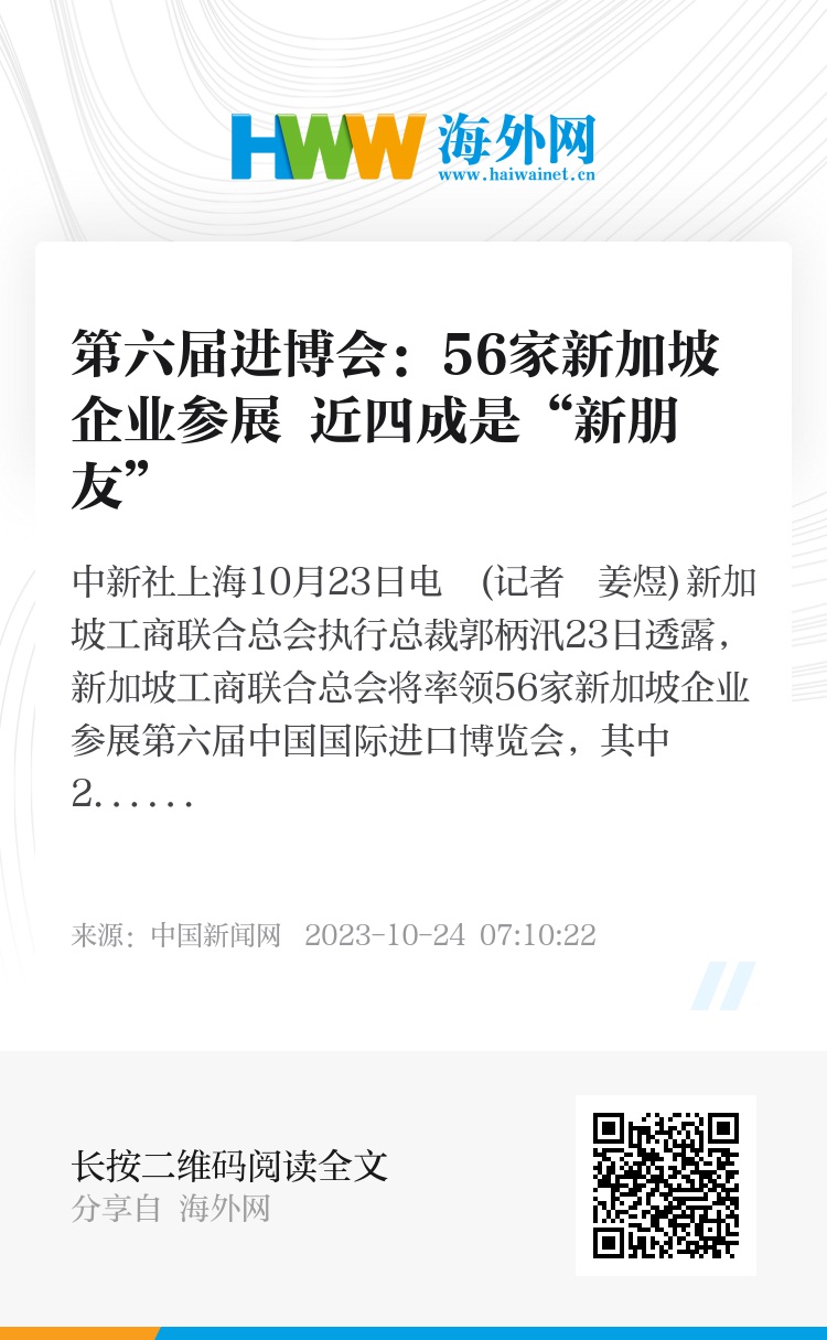 中新社上海10月23日电 (记者 姜煜)新加坡工商联合总会执行总裁郭柄汛23日透露,新加坡工商联合总会将率领56家新加坡企业参展第六届中国国际进口博览会,其中22家是首次参展进博会的“新朋友”。