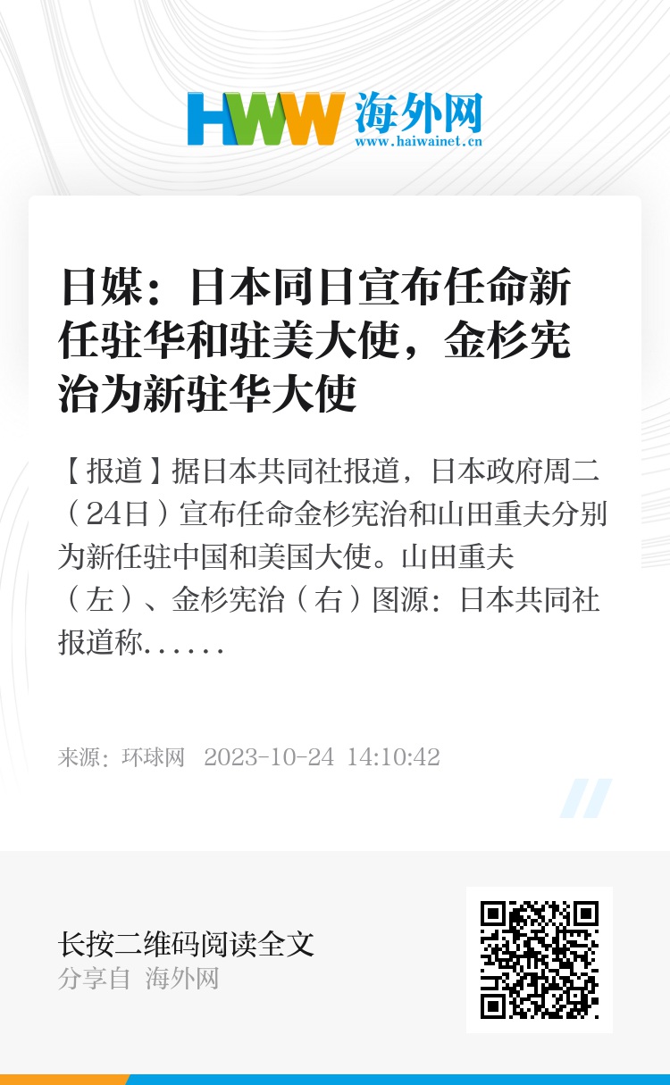 【环球网报道】据日本共同社报道,日本政府周二(24日)宣布任命金杉宪治和山田重夫分别为新任驻中国和美国大使。