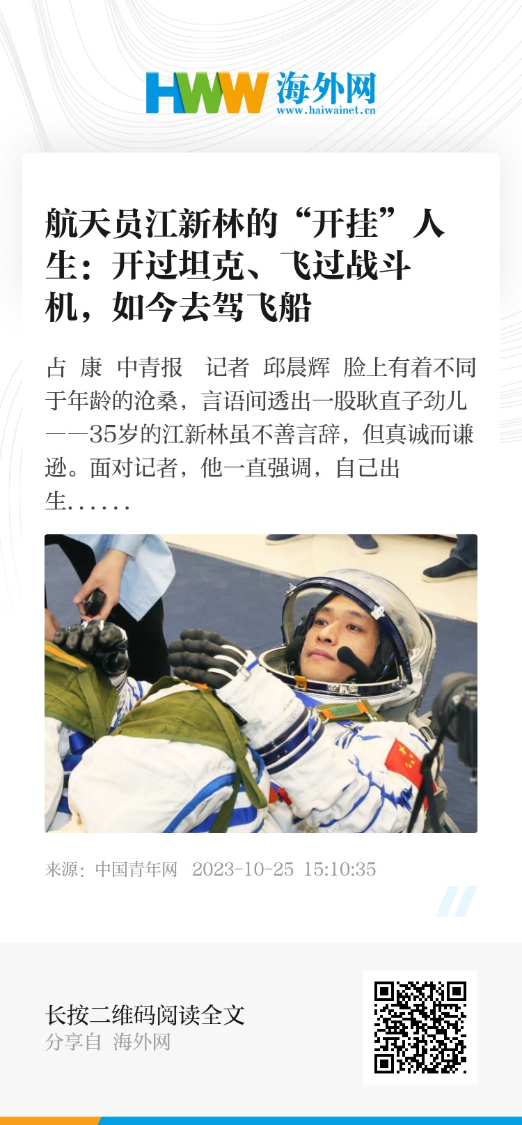 江新林的人生确实像“开挂”了一般,实现“三连跳”:在地上驾驶过坦克,在天上飞过战斗机,紧接着要驾乘飞船去遥远的太空。