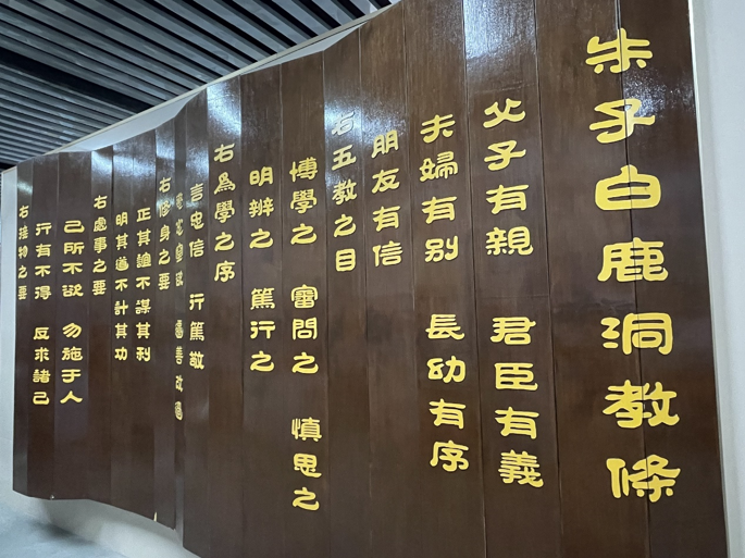 “父子有亲,君臣有义,夫妇有别,长幼有序,朋友有信……”从先贤书院拾级而上进入展厅,木纹底色展板上镌写的《朱子白鹿洞教条》赫然在目。这是复兴白鹿洞书院的南宋理学家朱熹为书院学生制定的学规,通过5个纲阐明修身、接物等方面的要求,汇集《论语》《孟子》中的思想精髓,简明扼要地阐述了“教育方针”。