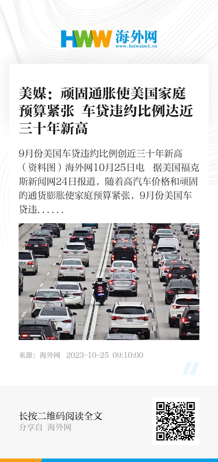 海外网10月25日电 据美国福克斯新闻网24日报道,随着高汽车价格和顽固的通货膨胀使家庭预算紧张,9月份美国车贷违约比例创历史新高,这对美国经济来说是一个不祥的迹象。