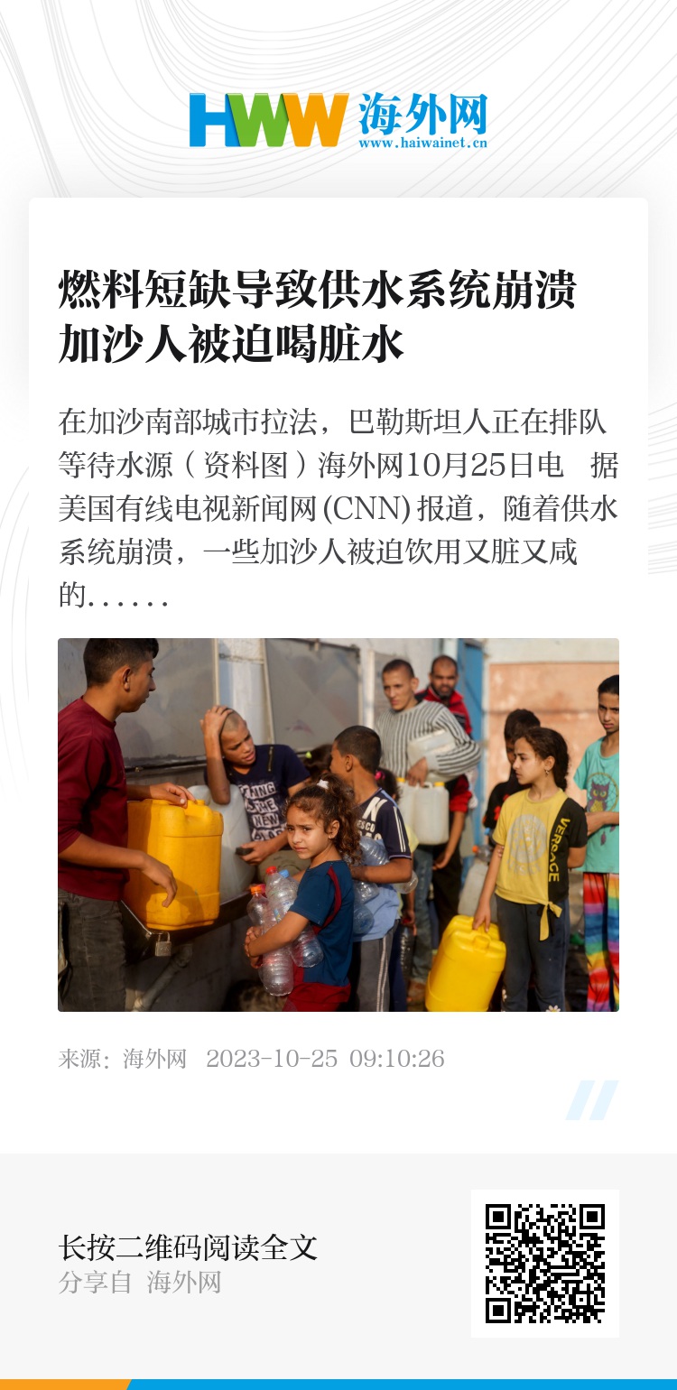 海外网10月25日电 据美国有线电视新闻网(CNN)报道,随着供水系统崩溃,一些加沙人被迫饮用又脏又咸的水。人们担忧由此引发健康危机,会导致当地居民因脱水而死亡。