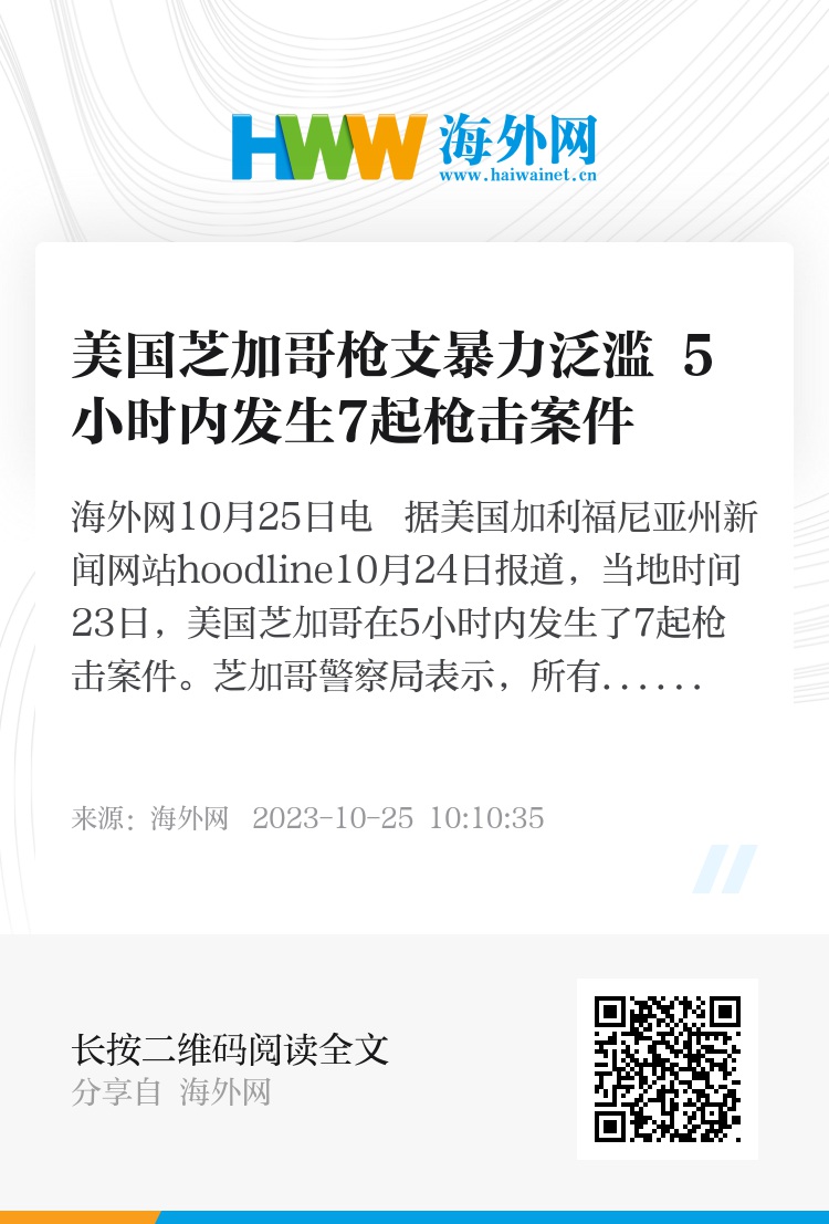 海外网10月25日电 据美国加利福尼亚州新闻网站hoodline10月24日报道,当地时间23日,美国芝加哥在5小时内发生了7起枪击案件。芝加哥警察局表示,所有受害者的身份背景和年龄各异,但他们都成为了该市持续枪支暴力的“牺牲品”。