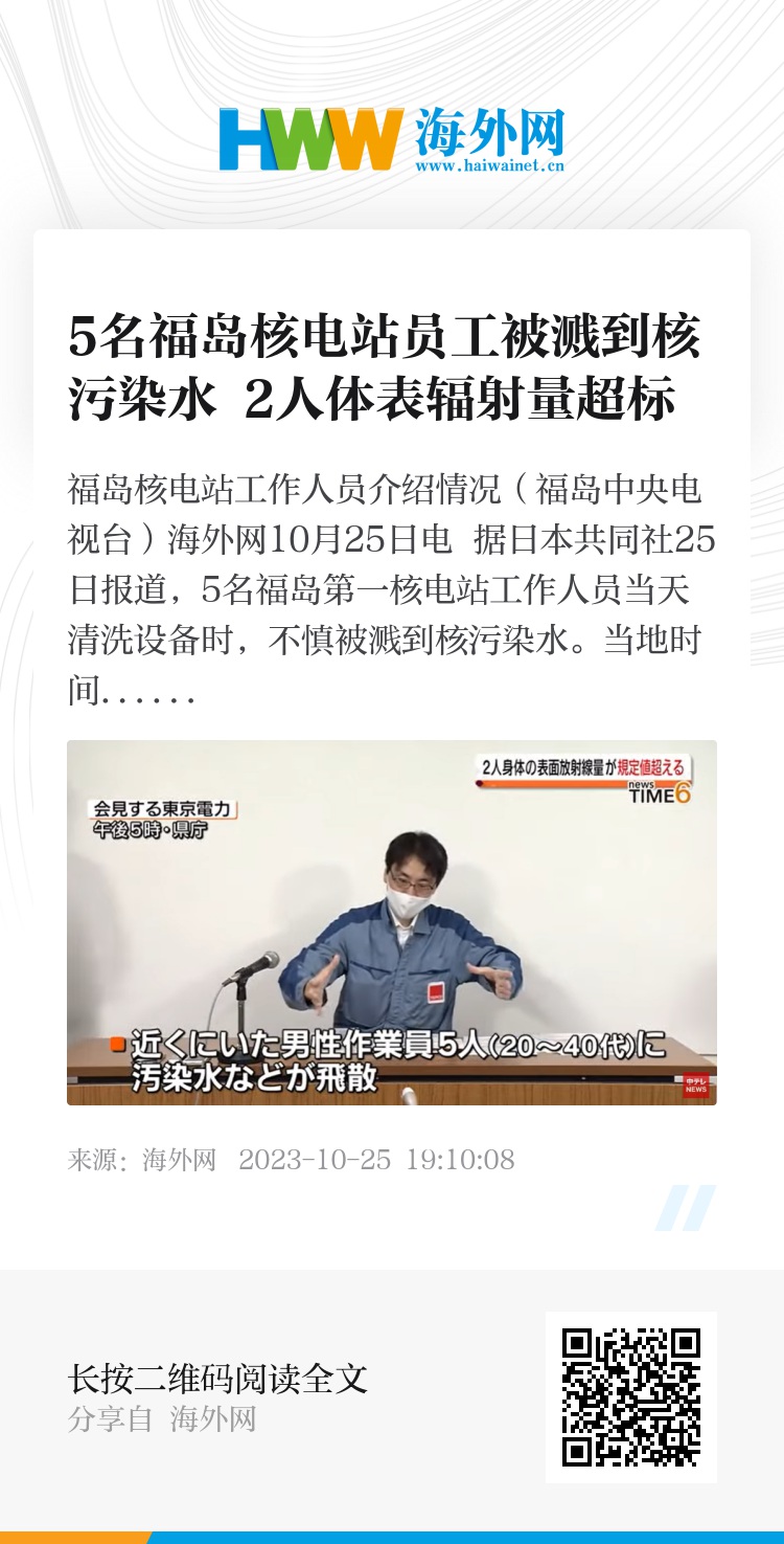 海外网10月25日电 据日本共同社25日报道,5名福岛第一核电站工作人员当天清洗设备时,不慎被溅到核污染水。