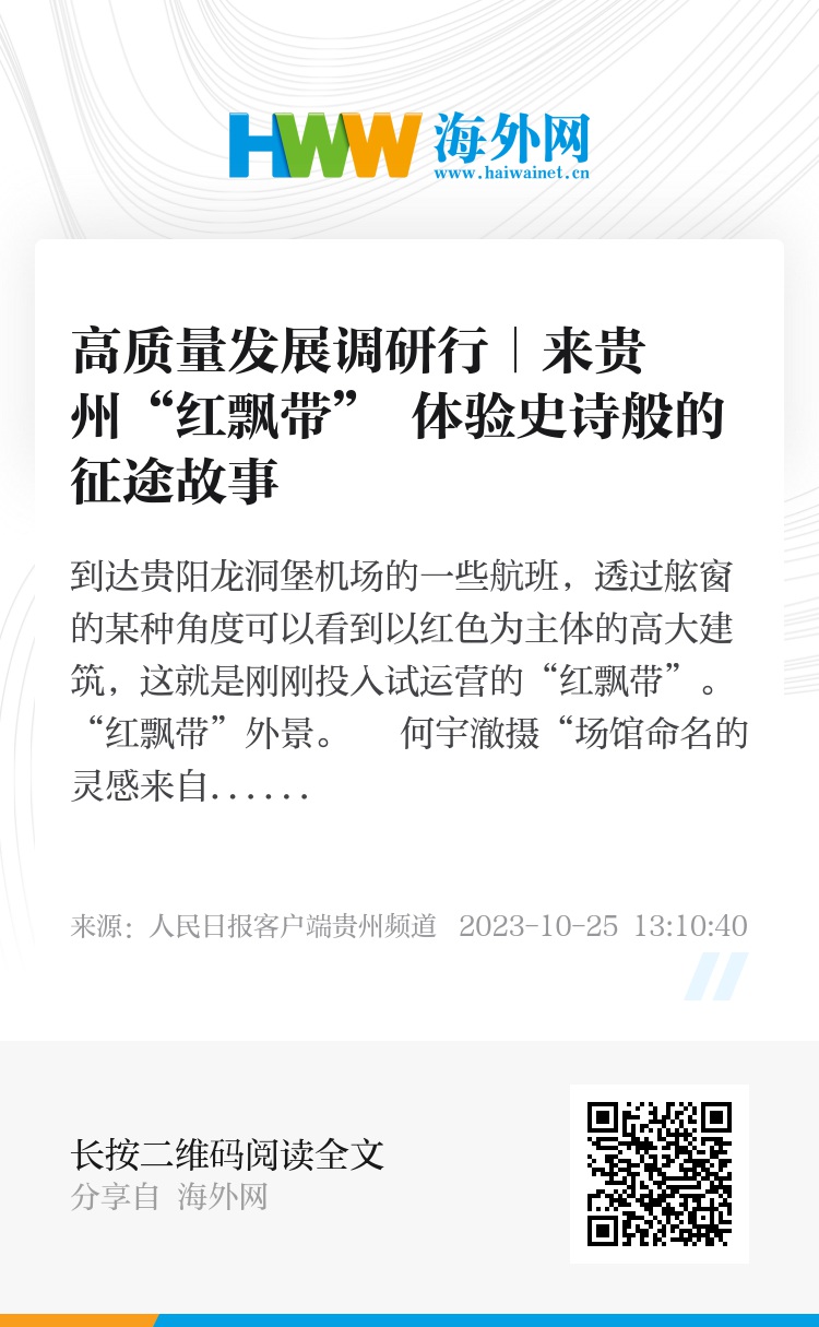 一直以来,贵州高度重视推动红旅发展提质升级,着力聚焦红色资源挖掘利用,将全民参与、传承教育贯穿始终,多措并举推动红色精神深入人心。今天,“红飘带”赋予长征精神新的直观感受,贵州文旅也如同摛锦布绣的鲜红飘带一般诞生出氤氲生光的古韵新潮。(葛燊 何宇澈)