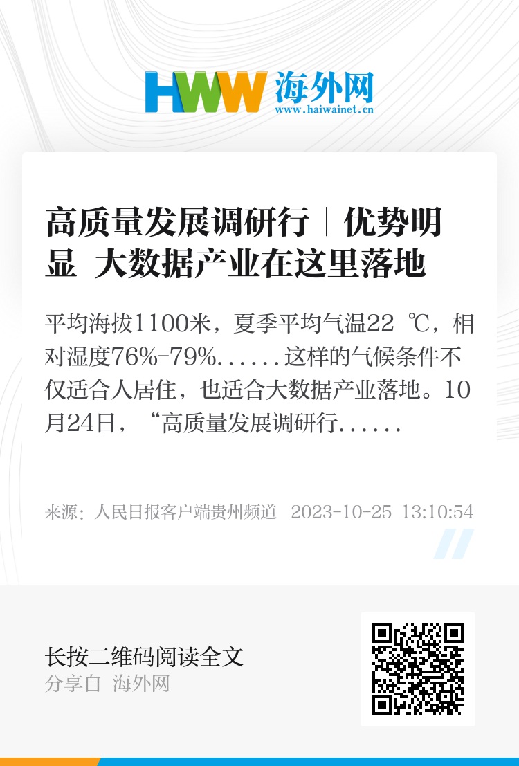 平均海拔1100米,夏季平均气温22 ℃,相对湿度76%-79%......这样的气候条件不仅适合人居住,也适合大数据产业落地。10月24日,“高质量发展调研行”贵州主题采访活动走进贵阳大数据科创城。