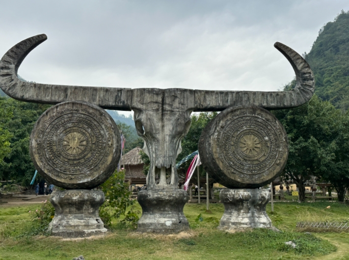 走进古寨,土墙茅草顶风格的房屋古韵悠悠,中央广场处的巨型牛头铜鼓庄重神秘,穿着传统服饰的瑶族妇女在家门口做着刺绣,原始质朴的传统村落给人一种穿越时空之感。