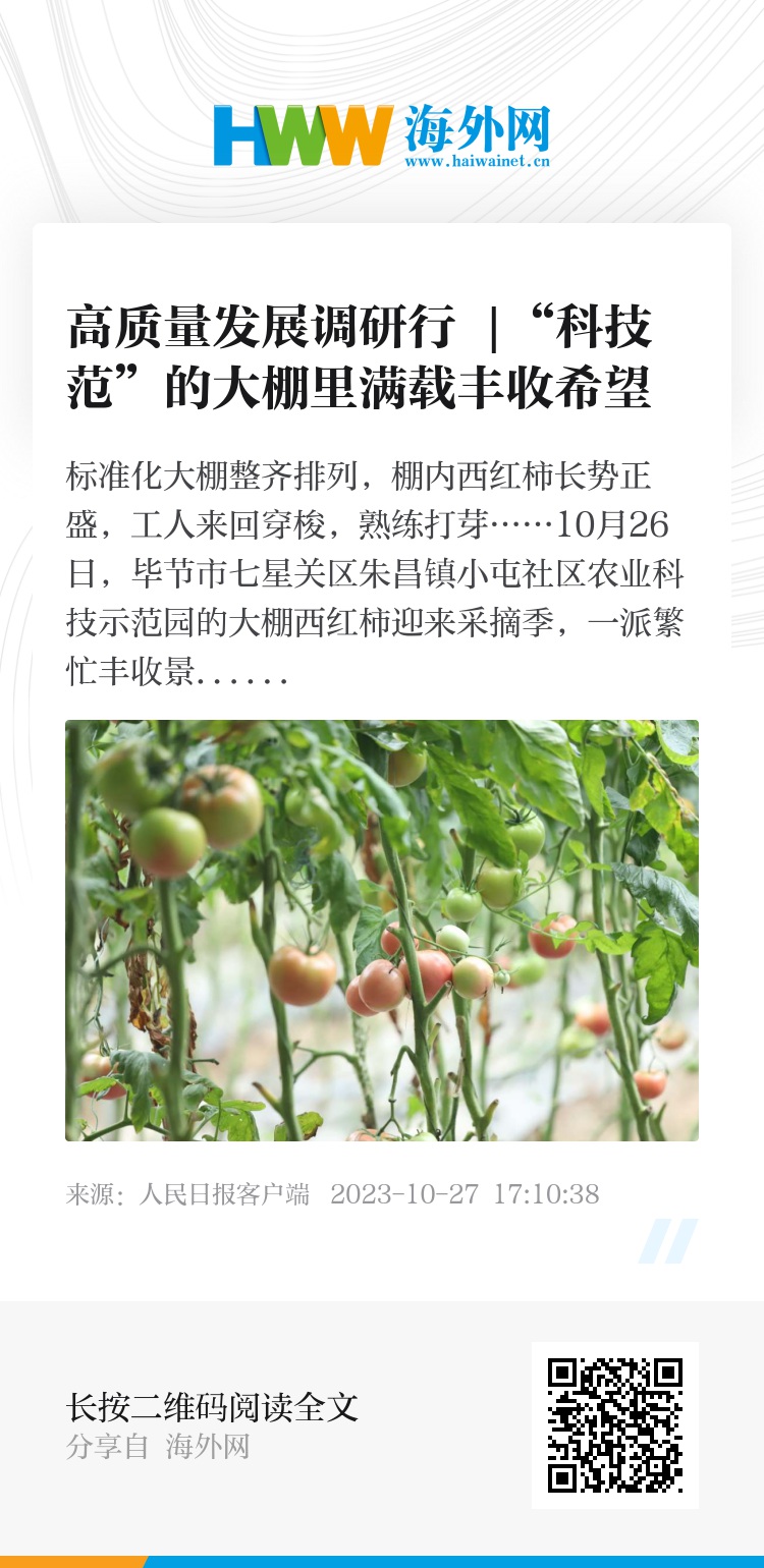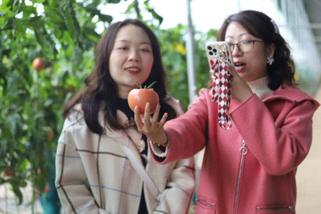 据了解,该园区的大棚已实现智能化水肥一体化,集自动通风、智能滴灌、智能补光于一体。针对当地气候特征,能适时调节棚内的环境,以便适应蔬菜生产种植。 近年来,毕节市七星关区朱昌镇积极发挥优势,引进现代农业企业在园区内新建57个第八代冬暖式大棚,对蔬菜生长各要素进行精准调节,以科技赋能农业丰收。 图为调研团记者用手机拍摄新鲜采摘的西红柿。苏滨 顾兰云 杨锏 摄影报道