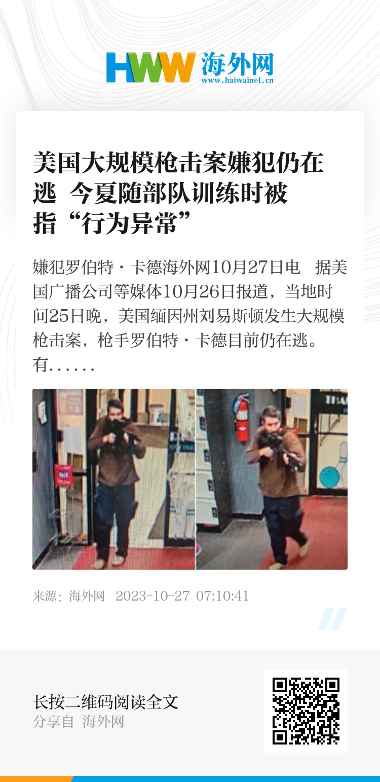 海外网10月27日电 据美国广播公司等媒体10月26日报道,当地时间25日晚,美国缅因州刘易斯顿发生大规模枪击案,枪手罗伯特·卡德目前仍在逃。有美国国防部官员透露,这名嫌犯在今年夏天随陆军预备役部队训练时“行为异常”。