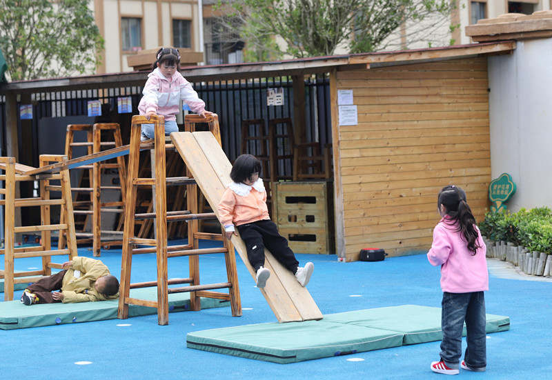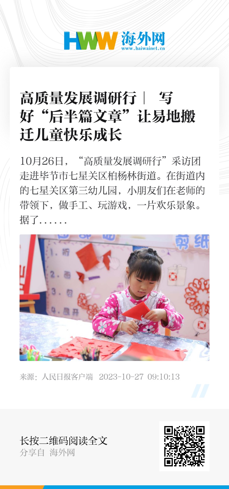 10月26日,“高质量发展调研行”采访团走进毕节市七星关区柏杨林街道。在街道内的七星关区第三幼儿园,小朋友们在老师的带领下,做手工、玩游戏,一片欢乐景象。 据了解,柏杨林街道是目前贵州省单体规模最大的易地扶贫搬迁安置点。为给搬迁孩子营造一个健康的成长环境,该街道积极写好易地扶贫搬迁“后半篇文章”,在配套建设幼儿园等基础设施的基础上,创新推动蜡染、刺绣、剪纸等手工艺进校园,进一步丰富课堂活动、传承传统文化,让易地搬迁儿童在快乐探索中健康成长。(苏滨 顾兰云 摄影报道)