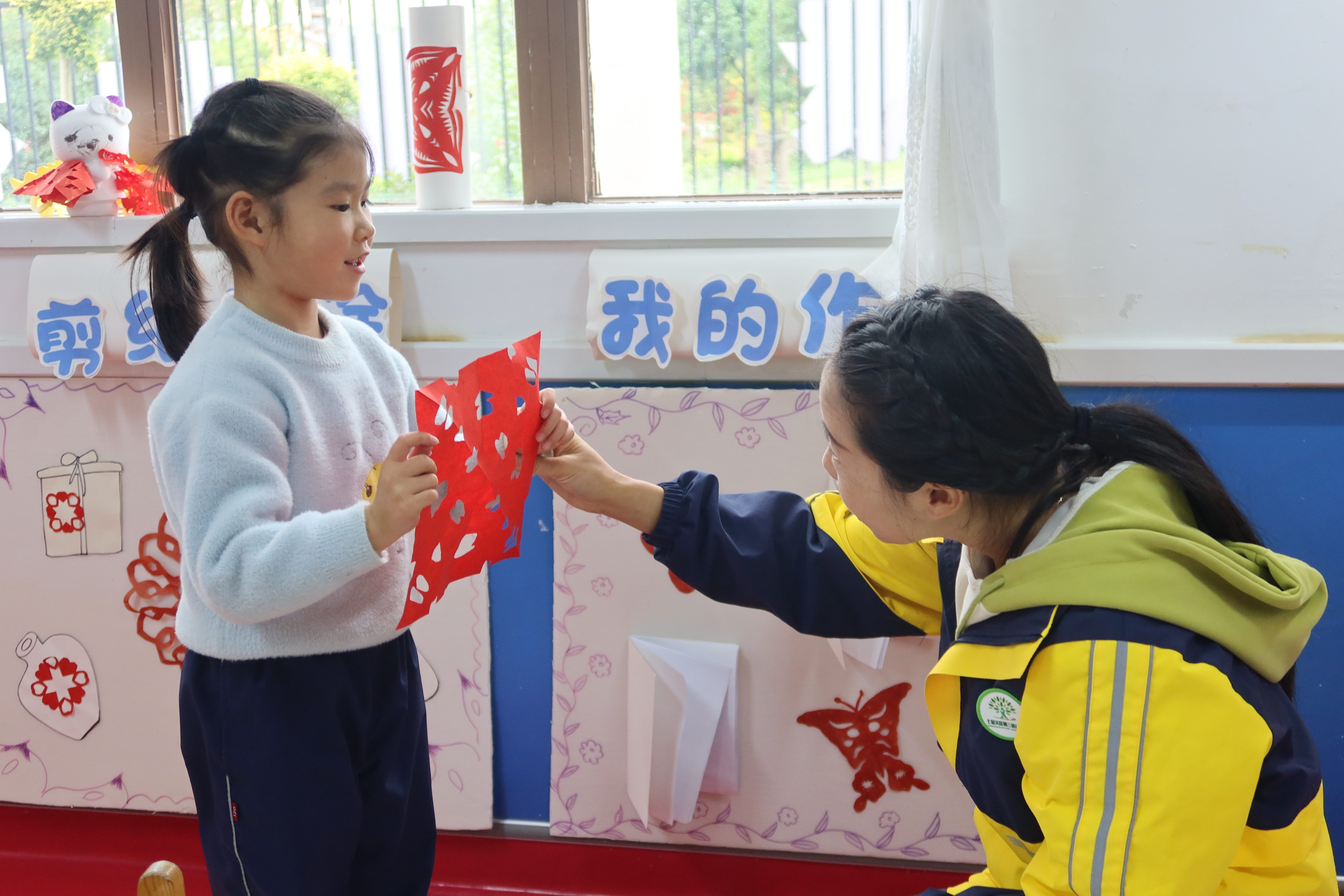 老师正在夸赞学生的剪纸作品。杨锏 摄