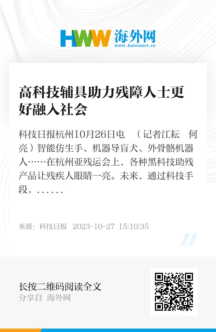 亚残运会期间,杭州专门举办了高科技辅具展示活动,吸引了众多残疾人士关注和体验。对此,杨英英表示,随着科技快速发展,高科技辅具和设施逐渐开发和普及,残疾人因此变得更加自信阳光,也更愿意融入社会。