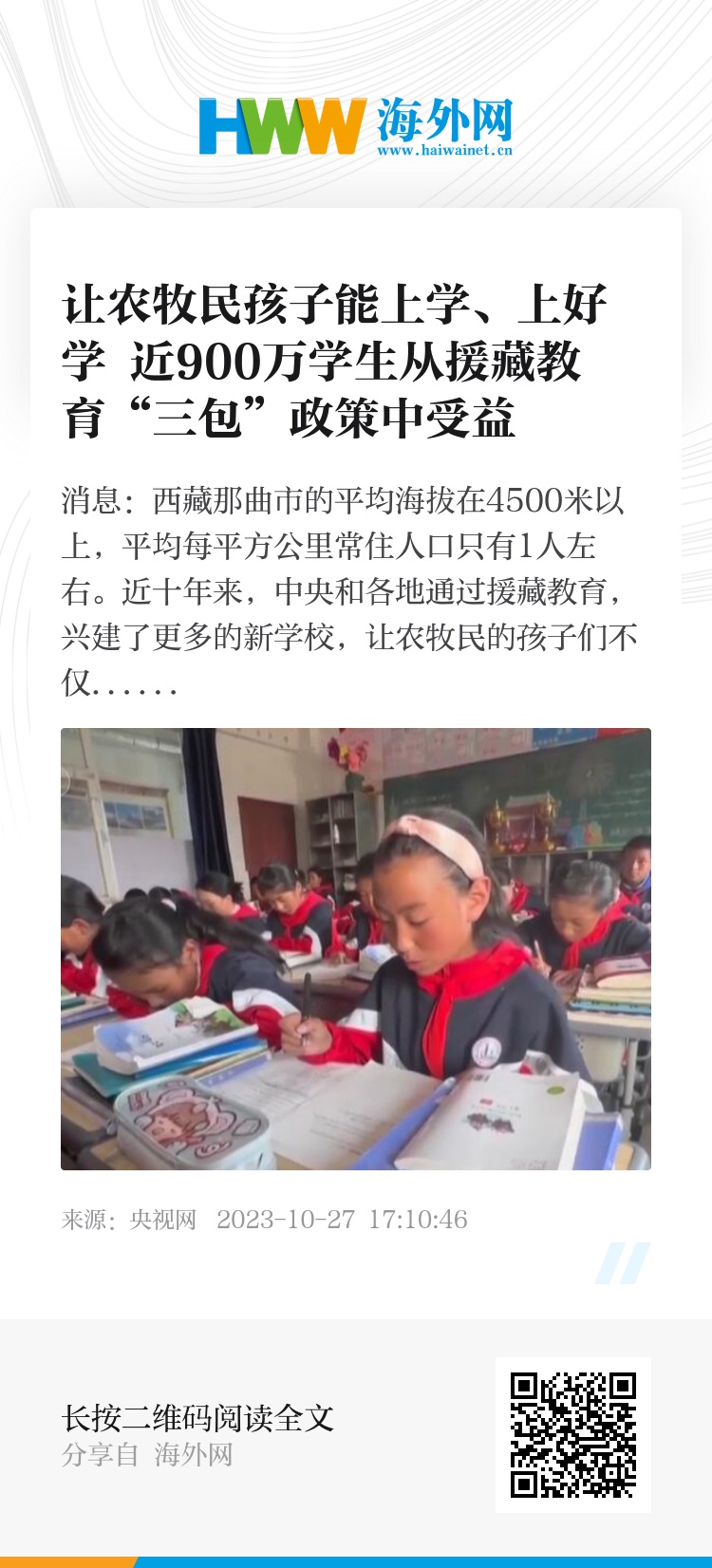 自1985年起,中央政府在西藏实施了教育“三包”政策,针对农牧民子女和城镇困难家庭子女实行包吃、包住、包学习费用,迄今累计投入超过230亿元,受益学生接近900万人次。