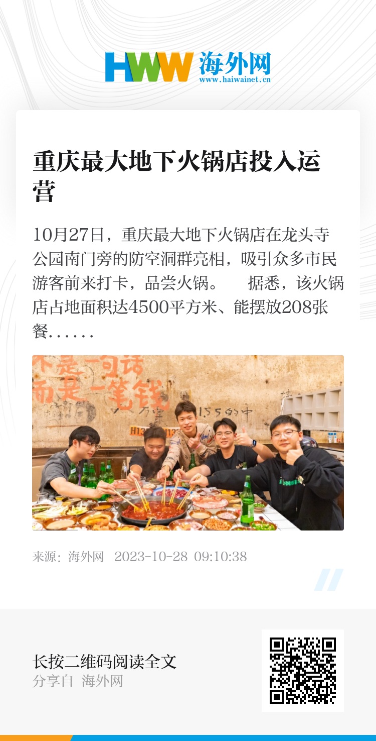 10月27日,重庆最大地下火锅店在龙头寺公园南门旁的防空洞群亮相,吸引众多市民游客前来打卡,品尝火锅。 据悉,该火锅店占地面积达4500平方米、能摆放208张餐桌,是“地下之城”——胡家岩文旅小镇的项目之一。按照规划,项目开发方将利用胡家岩约2万平方米的防空洞群,按照4A级都市旅游风景区标准,打造一个城市级文旅综合体。 近年来,重庆积极推动防空洞保护利用与文旅项目深度融合,消费新业态、新场景不断丰富,山城防空洞日渐成为重庆文旅发展新亮点。今年以来,山城防空洞接待游客已突破100万人次。图片来源: IC photo