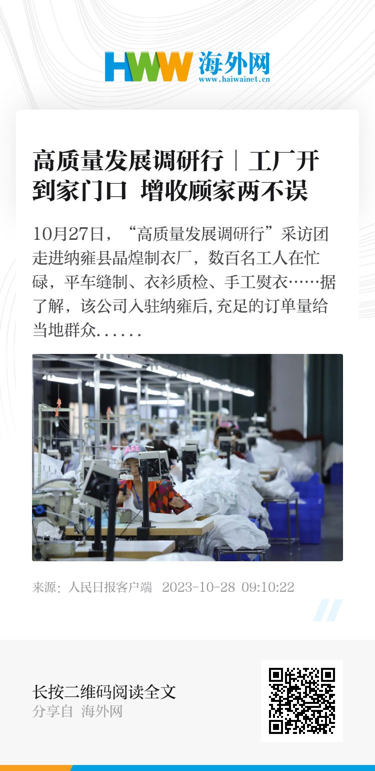 10月27日,“高质量发展调研行”采访团走进纳雍县晶煌制衣厂,数百名工人在忙碌,平车缝制、衣衫质检、手工熨衣……据了解,该公司入驻纳雍后,充足的订单量给当地群众铺就了一条家门口就业增收路,让大批群众实现赚钱顾家两不误的梦想。 图为工厂内工人缝制衣物,一派繁忙景象。苏滨 顾兰云 杨锏 摄影报道