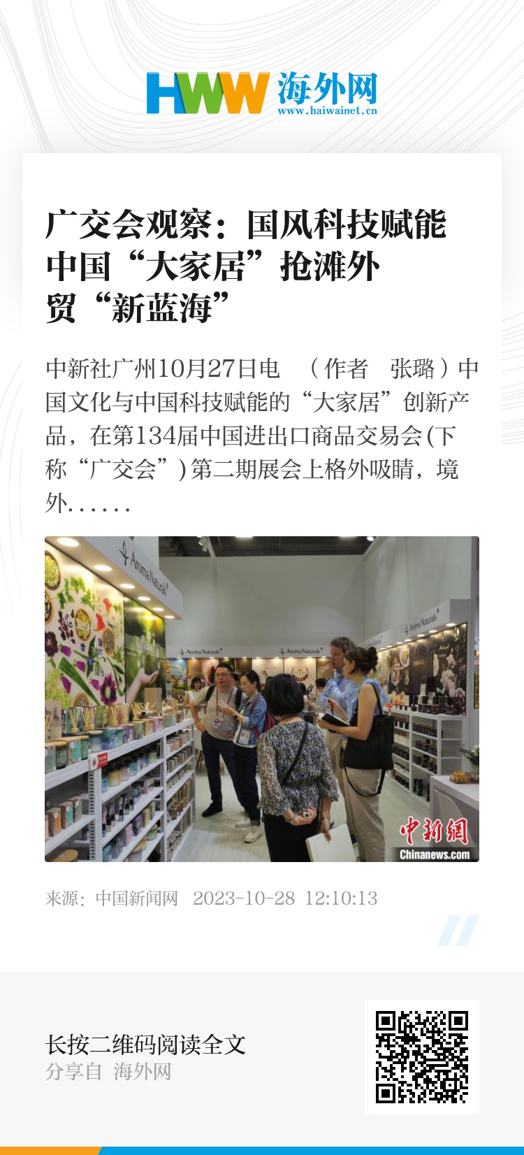 中新社广州10月27日电 (作者 张璐)中国文化与中国科技赋能的“大家居”创新产品,在第134届中国进出口商品交易会(下称“广交会”)第二期展会上格外吸睛,境外采购商纷纷下单订货,成为中国外贸的“新蓝海”。